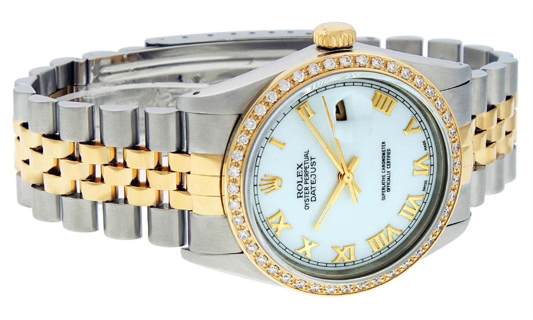 One Mens 14K Yellow Gold Two Tone Rolex Datejust Polished, Serviced & Electronically Tested, 14K Yellow Gold & Stainless Steel Case: 36mm, 14K Yellow Gold Crown, Custom Bezel: 18K Yellow Gold Beadset Diamond Bezel, Diamond Count: 44 Diamonds, Total Weight 1.00 Carat, Clarity: SI-VS, Color: G to H. Custom Crystal: New Synthetic Sapphire Cyclops Lens. Custom Hands: New Luminecent Hands. Movement: Automatic Winding Movement Caliber 3035. Custom Dial: Mother Of Pearl Roman Dial. Date Window: 3 O'Clock Position Date Display, Quickset, Model: 16013 Condition: G-6 Extra Fine. Bracelet: Two Tone 14K Yellow Gold & Stainless Steel Jubilee. Bright Polish. 7.0 Inch Length, Adjustable. Standard Clasp, With Rolex Logo. This Watch Has Been Serviced Time Tested And Is In Excellent Condition It Is Free Of All Scratches And Dents.
