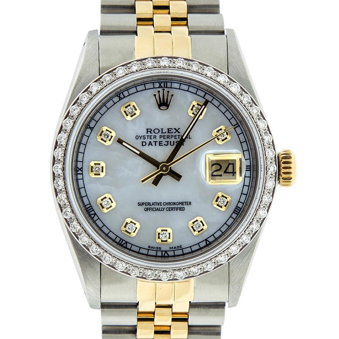 One Mens 14K Yellow Gold Two Tone Rolex Datejust Polished, Serviced & Electronically Tested, 14K Yellow Gold & Stainless Steel Case: 36mm, 14K Yellow Gold Crown, Custom Bezel: 18K White Gold Beadset Diamond Bezel, Diamond Count: 44 Diamonds, Total Weight 1.00 Carat, Clarity: SI-VS, Color: G to H. Custom Crystal: New Synthetic Sapphire Cyclops Lens. Custom Hands: New Luminecent Hands. Movement: Automatic Winding Movement Caliber 3035. Custom Dial: Mother Of Pearl Diamond Dial, 10 Diamonds in Dial G To H In Color, SI-VS Clarity, Date Window: 3 O'Clock Position Date Display, Quickset, Model: 16013 Datejust. Condition: G-6 Extra Fine. Bracelet:Two Tone 14K Yellow Gold & Stainless Steel Jubilee. Bright Polish. 7.0 Inch Length, Adjustable. Standard Clasp, With Rolex Logo. This Watch Has Been Serviced Time Tested And Is In Excellent Condition It Is Free Of All Scratches And Dents.