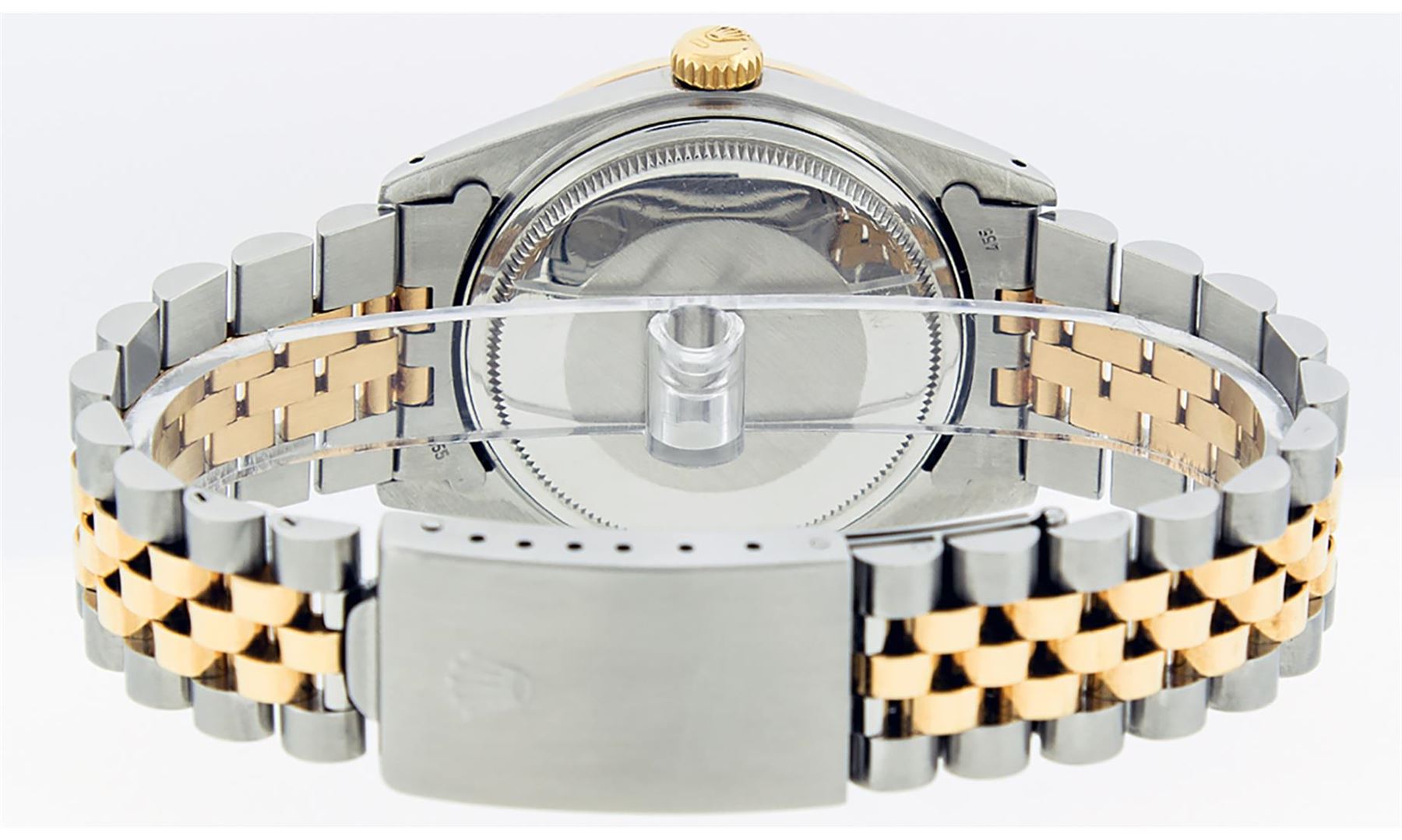One Mens 14K Yellow Gold Two Tone Rolex Datejust Polished, Serviced & Electronically Tested, 14K Yellow Gold & Stainless Steel Case: 36mm, 14K Yellow Gold Crown, Custom Bezel: New 18K Yellow Gold Beadset Diamond Bezel, Diamond Count: 44 Diamonds, Total Weight 1.00 Carat, Clarity: SI-VS, Color: G to H. Custom Crystal: New Scratch Resisitant Synthetic Sapphire Cyclops Lens. Movement: Automatic Winding Movement Caliber 3035. Custom Dial: Mother Of Pearl Dial Set With Diamond Hour Markers and Synthetic Emerald Baguette Markers On 6 and 9, Stone Count: 8 + 2 Synthetic Emerald Bagguettes, Color: G To H In Color, Clarity: SI-VS, Date Window: 3 O'Clock Position Date Display, Quickset, Model: 16013 Datejust. Condition: G-6 Extra Fine. Bracelet: Two Tone 14K Yellow Gold & Stainless Steel Jubilee. Bright Polish. 7.0 Inch Length, Adjustable. Standard Clasp, With Rolex Logo. This Watch Has Been Serviced Time Tested And Is In Excellent Condition It Is Free Of All Scratches And Dents.
