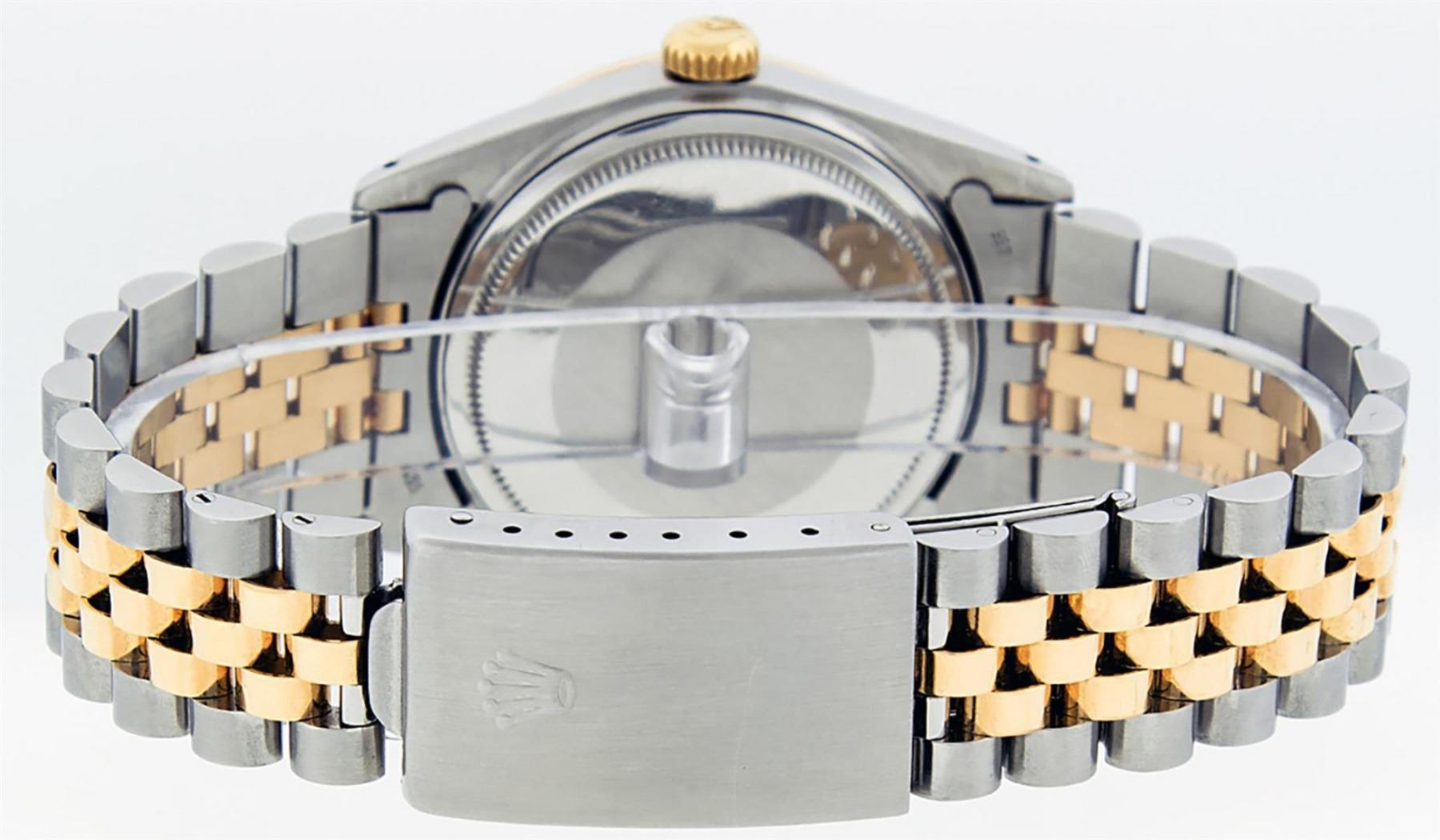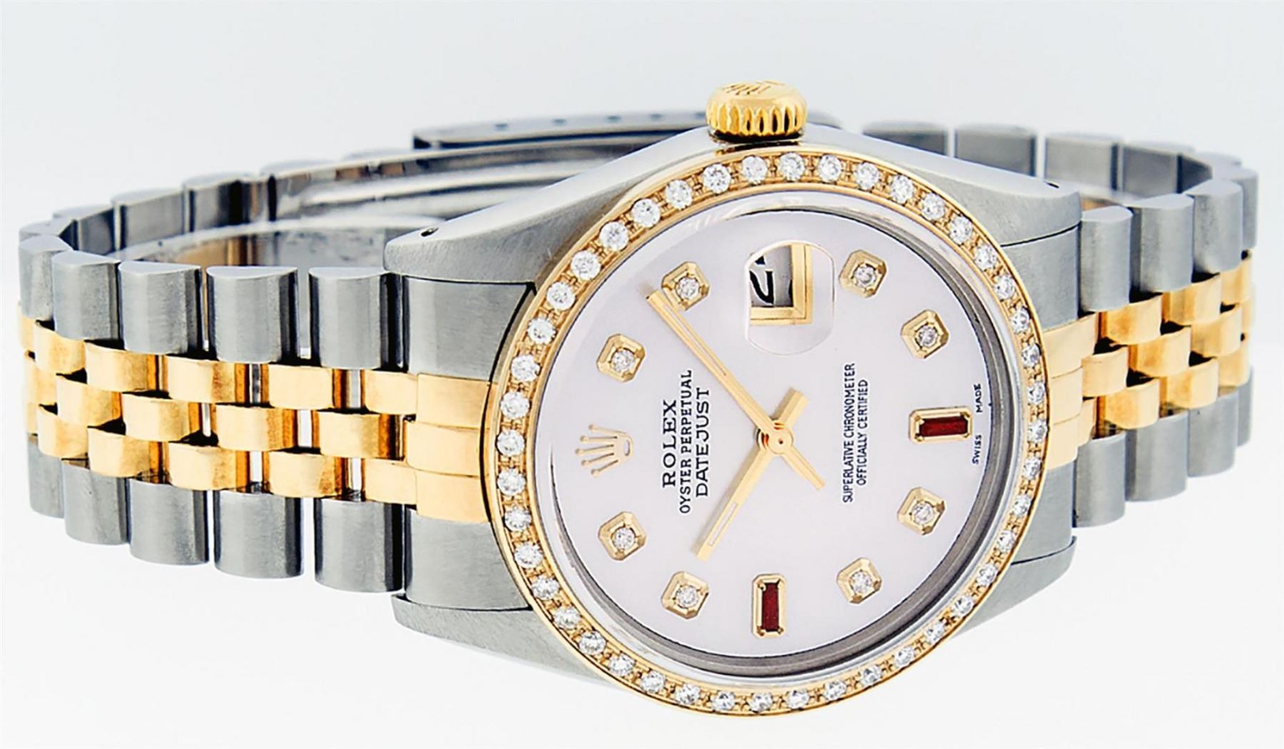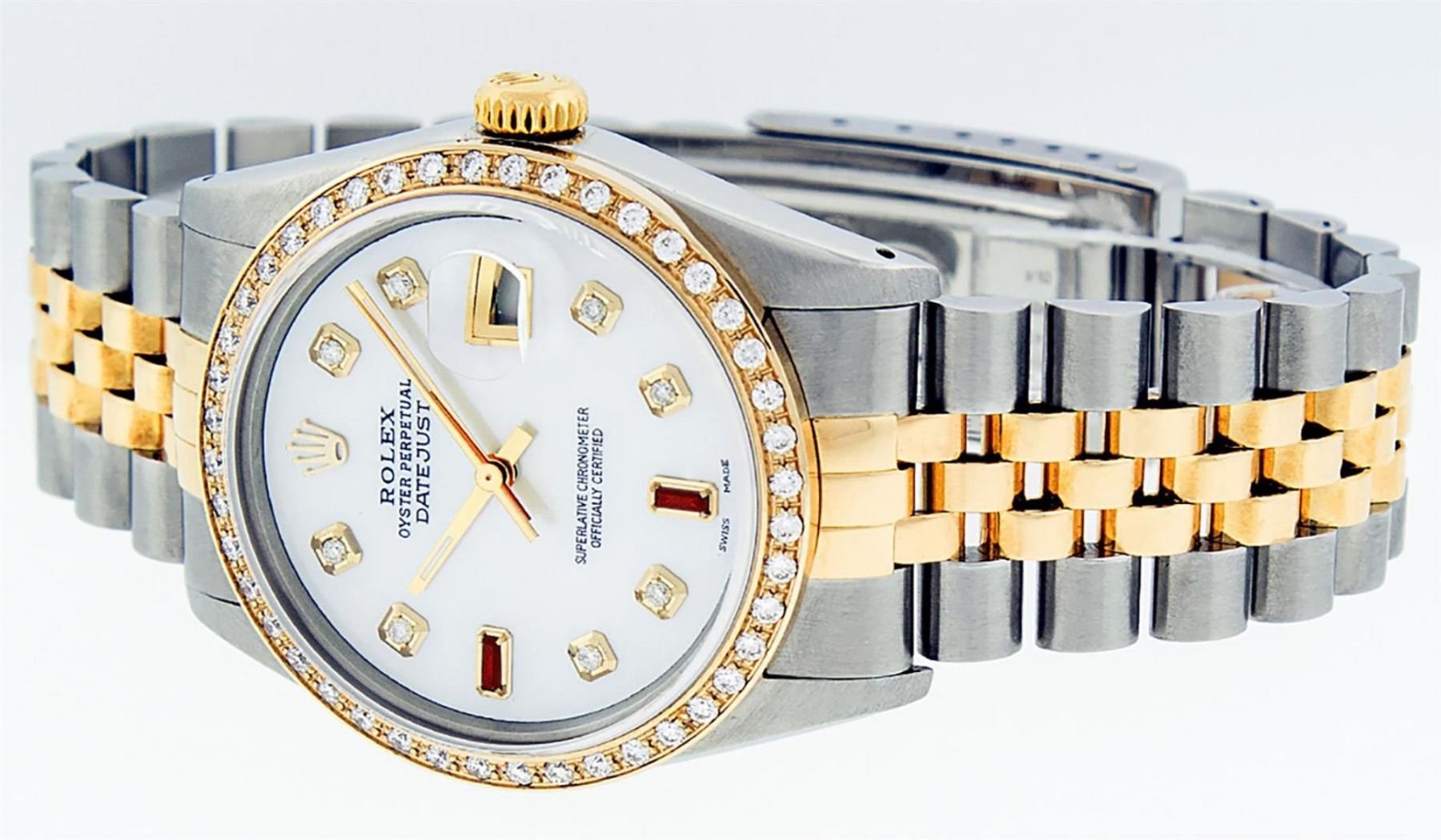 One Mens 14K Yellow Gold Two Tone Rolex Datejust Polished, Serviced & Electronically Tested, 14K Yellow Gold & Stainless Steel Case: 36mm, 14K Yellow Gold Crown, Custom Bezel: New 18K Yellow Gold Beadset Diamond Bezel, Diamond Count:�44 Diamonds, Total Weight 1.00 Carat, Clarity: SI-VS, Color: G to H. Custom Crystal: New Scratch Resistant Synthetic Sapphire Cyclops Lens. Movement: Automatic Winding Movement Caliber 3035. Custom Dial: Mother Of Pearl Dial Set�With Diamond Hour Markers and Synthetic Ruby Baguette Markers On 6 and 9,�Stone Count: 8 + 2 Synthetic Ruby Bagguettes, Color: G To H In Color, Clarity: SI-VS, Date Window: 3 O'Clock Position Date Display,�Quickset, Model: 16013 Datejust. Condition: G-6 Extra Fine. Bracelet: Two Tone 14K Yellow Gold & Stainless Steel Jubilee. Bright Polish.�7.0 Inch Length, Adjustable. Standard Clasp, With Rolex Logo. This Watch Has Been Serviced Time Tested And Is In Excellent Condition It Is Free Of All Scratches And Dents.