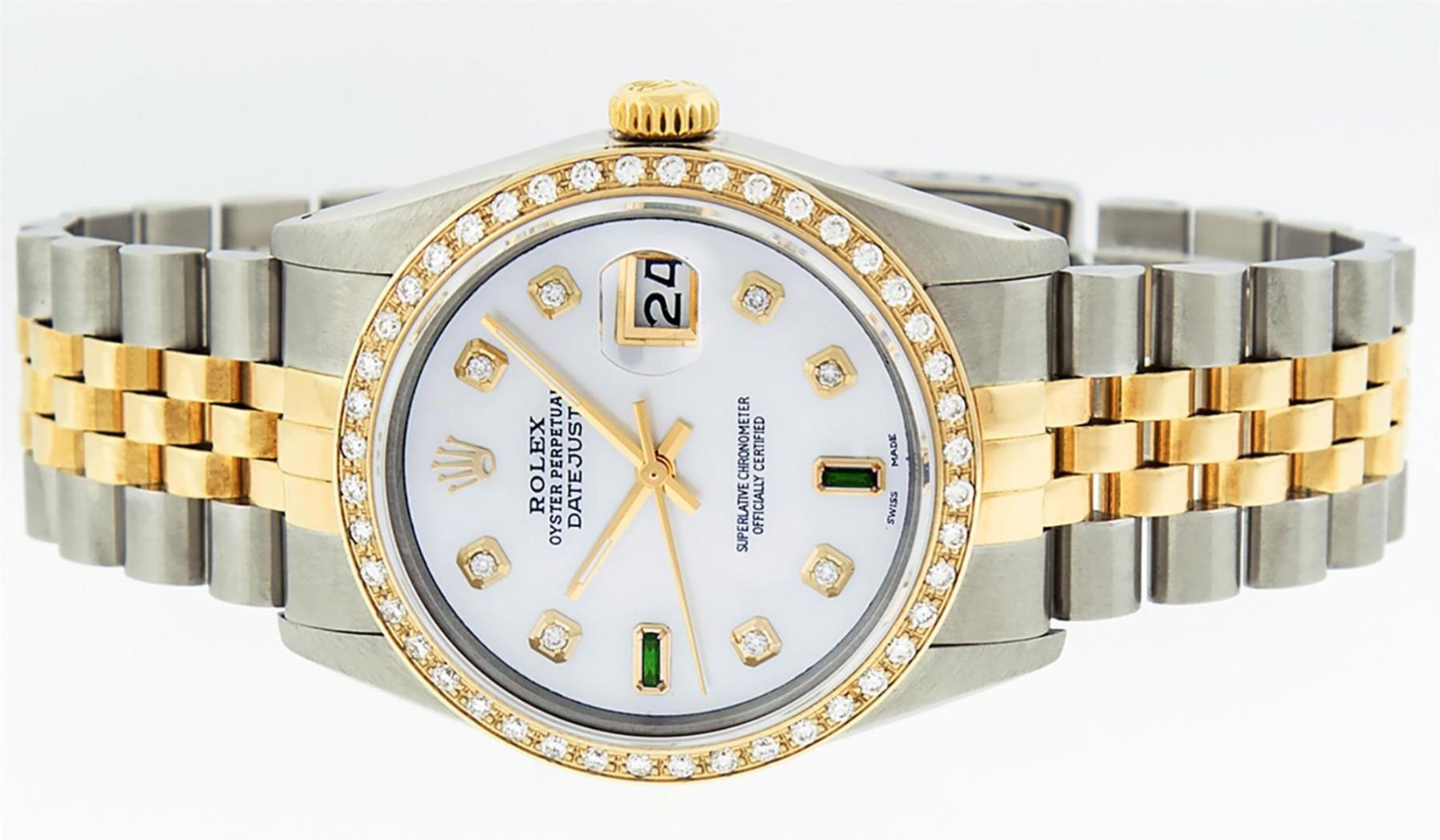One Mens 14K Yellow Gold Two Tone Rolex Datejust Polished, Serviced & Electronically Tested, 14K Yellow Gold & Stainless Steel Case: 36mm, 14K Yellow Gold Crown, Custom Bezel: New 18K Yellow Gold Beadset Diamond Bezel, Diamond Count:�44 Diamonds, Total Weight 1.00 Carat, Clarity: SI-VS, Color: G to H. Custom Crystal: New Scratch Resisitant Synthetic Sapphire Cyclops Lens. Movement: Automatic Winding Movement Caliber 3035. Custom Dial: Mother Of Pearl Dial Set�With Diamond Hour Markers and Synthetic Emerald Baguette Markers On 6 and 9, Stone Count: 8 + 2 Synthetic Emerald Bagguettes, Color: G To H In Color, Clarity: SI-VS, Date Window: 3 O'Clock Position Date Display,�Quickset, Model: 16013 Datejust. Condition: G-6 Extra Fine. Bracelet: Two Tone 14K Yellow Gold & Stainless Steel Jubilee. Bright Polish.�7.0 Inch Length, Adjustable. Standard Clasp, With Rolex Logo. This Watch Has Been Serviced Time Tested And Is In Excellent Condition It Is Free Of All Scratches And Dents.