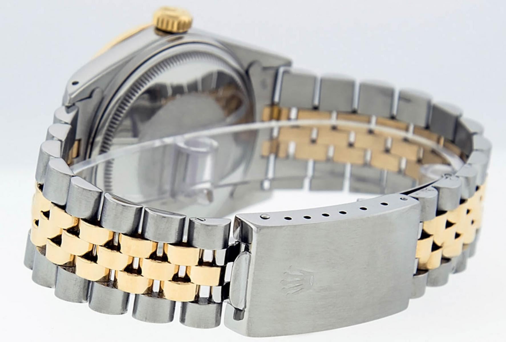One Mens 14K Yellow Gold Two Tone Rolex Datejust Polished, Serviced & Electronically Tested, 14K Yellow Gold & Stainless Steel Case: 36mm, 14K Yellow Gold Crown, Custom Bezel: 18K White Gold Beadset Diamond Bezel, Diamond Count: 44 Diamonds, Total Weight 1.00 Carat, Clarity: SI-VS, Color: G to H. Custom Crystal: New Synthetic Sapphire Cyclops Lens. Custom Hands: New Luminecent Hands. Movement: Automatic Winding Movement Caliber 3035. Custom Dial: Mother Of Pearl Diamond Dial, 10 Diamonds in Dial G To H In Color, SI-VS Clarity, Date Window: 3 O'Clock Position Date Display, Quickset, Model: 16013 Datejust. Condition: G-6 Extra Fine. Bracelet:Two Tone 14K Yellow Gold & Stainless Steel Jubilee. Bright Polish. 7.0 Inch Length, Adjustable. Standard Clasp, With Rolex Logo. This Watch Has Been Serviced Time Tested And Is In Excellent Condition It Is Free Of All Scratches And Dents.