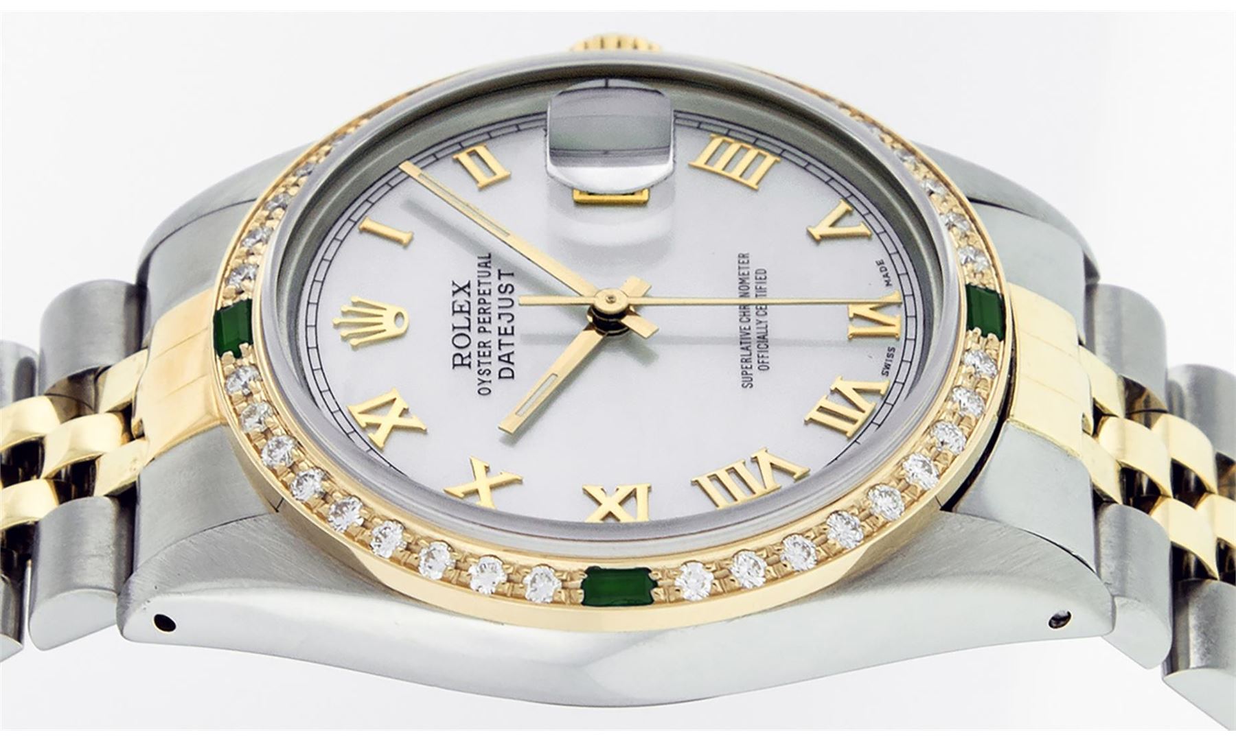 One Mens 14K Yellow Gold Two Tone Rolex Datejust Polished, Serviced & Electronically Tested, 14K Yellow Gold & Stainless Steel Case: 36mm, 14K Yellow Gold Crown, Custom Bezel: New 18K Yellow Gold Beadset & Emerald Diamond Bezel, Stone Count: 36 Diamonds + 4 Emeralds, Total Weight 1.00 Carat, Clarity: SI-VS, Color: G to H. Custom Crystal: New Synthetic Sapphire Cyclops Lens. Custom Hands: New Luminecent Hands. Movement: Automatic Winding Movement Caliber 3035. Custom Dial: Mother Of Pearl Roman Dial With Square Track. Date Window: 3 O'Clock Position Date Display, Quickset, Model: 16013 Datejust. Condition: G-6 Extra Fine. Bracelet: Two Tone 14K Yellow Gold & Stainless Steel Jubilee. Bright Polish. 7.0 Inch Length, Adjustable. Standard Clasp, With Rolex Logo. This Watch Has Been Serviced Time Tested And Is In Excellent Condition It Is Free Of All Scratches And Dents.