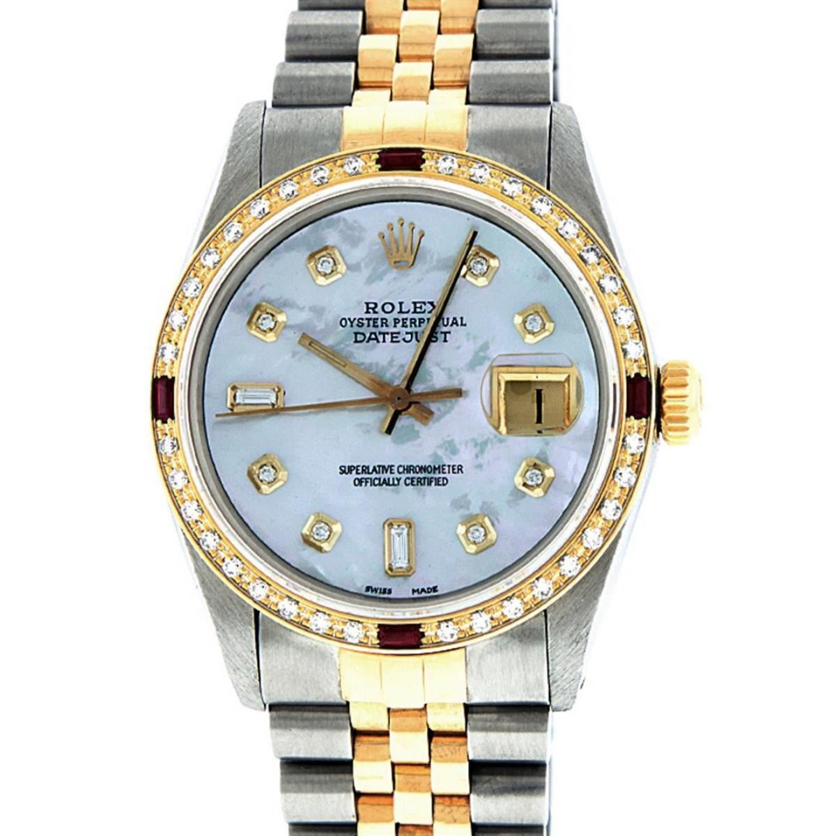 One Mens 14K Yellow Gold Two Tone Rolex Datejust Polished, Serviced & Electronically Tested, 14K Yellow Gold & Stainless Steel Case: 36mm, 14K Yellow Gold Crown, Custom Bezel: New 18K Yellow Gold Ruby Beadset Diamond Bezel, Diamond Count: 36 Diamonds + 4 Rubies Total Weight 1.00 Carat, Clarity: SI-VS, Color: G to H. Custom Crystal: New Synthetic Sapphire Cyclops Lens. Movement: Automatic Winding Movement Caliber 3035. Custom Dial: Mother Of Pearl Dial Set With Diamond Hour Markers and Baguette Diamond Markers On 6 and 9, Diamond Count: 8 + 2 Bagguette Diamonds in Dial, G To H In Color , Date Window: 3 O'Clock Position Date Display,  Quickset, Model: 16013 Datejust, Condition: G-6 Extra Fine. Bracelet: Two Tone 14K Yellow Gold & Stainless Steel Jubilee. Bright Polish. 7.0 Inch Length, Adjustable. Standard Clasp, With Rolex Logo. This Watch Has Been Serviced Time Tested And Is In Excellent Condition It Is Free Of All Scratches And Dents.