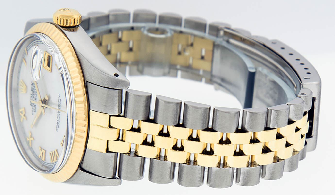 One Mens 14K Yellow Gold Two Tone Rolex Datejust Polished, Serviced & Electronically Tested, 14K Yellow Gold & Stainless Steel Case: 36mm,14K Yellow Gold Crown, Bezel: 14K Yellow Gold Fluted Bezel. Custom Crystal: New Acrylic Cyclops Lens. Custom Hands: New Luminecent Hands. Movement: Automatic Winding Movement Caliber 3035. Custom Dial: Mother Of Pearl Roman With Square Track. Date Window: 3 O'Clock Position Date Display, Quickset, Model: 16013 Datejust. Condition: G-6 Extra Fine. Bracelet:Two Tone 14K Yellow Gold & Stainless Steel Jubilee. Bright Polish. 7.0 Inch Length, Adjustable. Standard Clasp, With Rolex Logo. This Watch Has Been Serviced Time Tested And Is In Excellent Condition It Is Free Of All Scratches And Dents.
