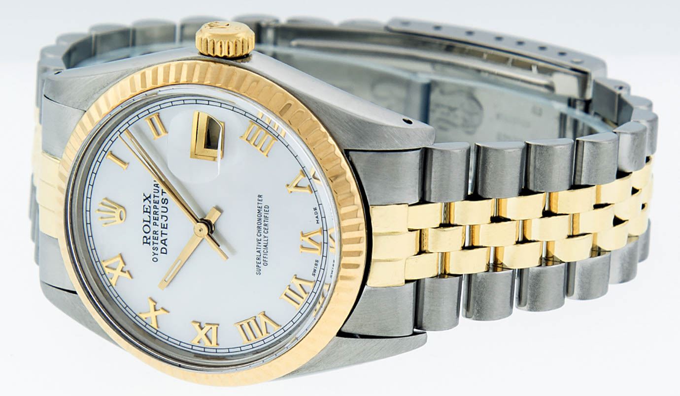 One Mens 14K Yellow Gold Two Tone Rolex Datejust Polished, Serviced & Electronically Tested, 14K Yellow Gold & Stainless Steel Case: 36mm,14K Yellow Gold Crown, Bezel: 14K Yellow Gold Fluted Bezel. Custom Crystal: New Acrylic Cyclops Lens. Custom Hands: New Luminecent Hands. Movement: Automatic Winding Movement Caliber 3035. Custom Dial: Mother Of Pearl Roman With Square Track. Date Window: 3 O'Clock Position Date Display, Quickset, Model: 16013 Datejust. Condition: G-6 Extra Fine. Bracelet:Two Tone 14K Yellow Gold & Stainless Steel Jubilee. Bright Polish. 7.0 Inch Length, Adjustable. Standard Clasp, With Rolex Logo. This Watch Has Been Serviced Time Tested And Is In Excellent Condition It Is Free Of All Scratches And Dents.