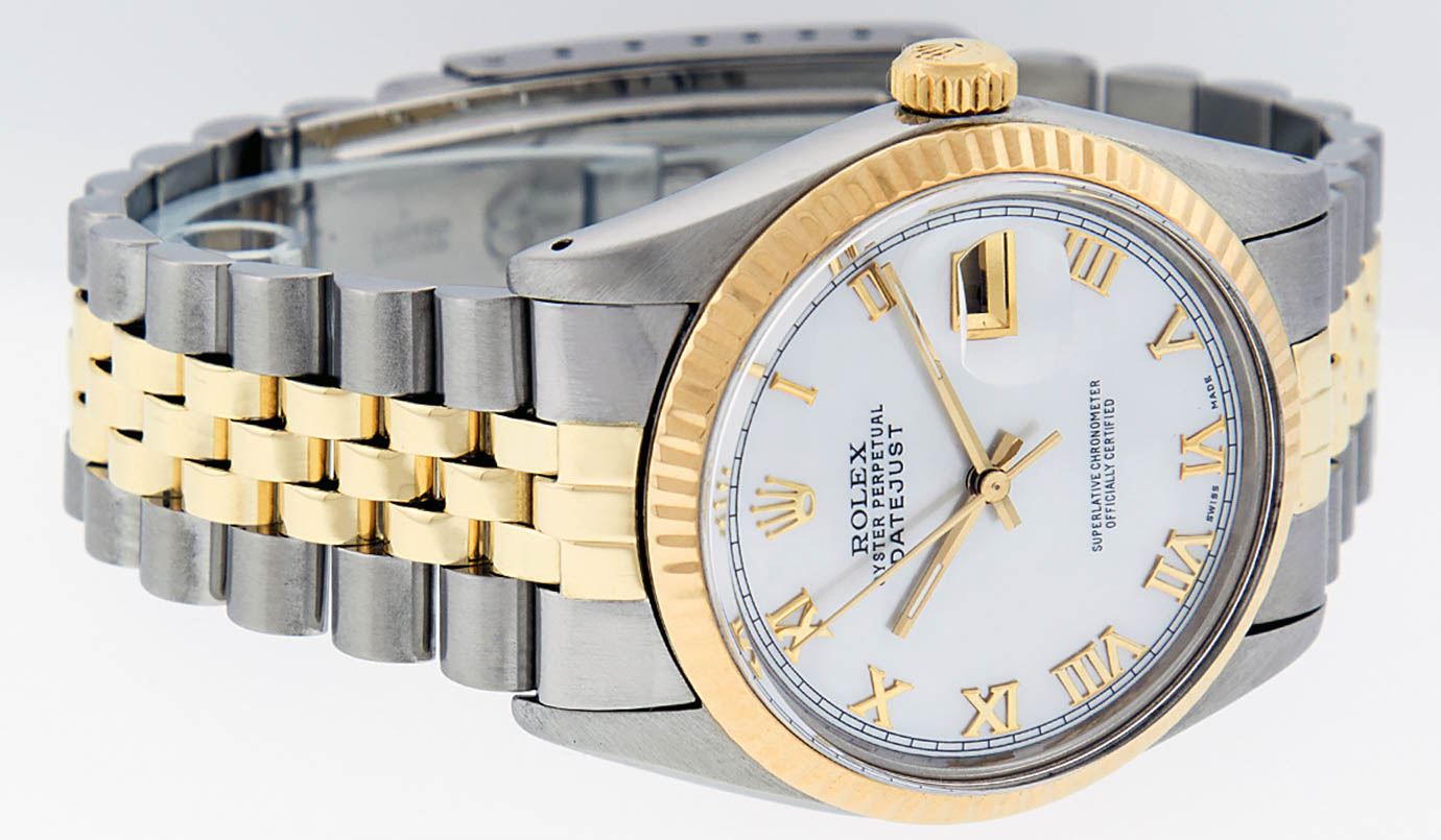 One Mens 14K Yellow Gold Two Tone Rolex Datejust Polished, Serviced & Electronically Tested, 14K Yellow Gold & Stainless Steel Case: 36mm,14K Yellow Gold Crown, Bezel: 14K Yellow Gold Fluted Bezel. Custom Crystal: New Acrylic Cyclops Lens. Custom Hands: New Luminecent Hands. Movement: Automatic Winding Movement Caliber 3035. Custom Dial: Mother Of Pearl Roman With Square Track. Date Window: 3 O'Clock Position Date Display, Quickset, Model: 16013 Datejust. Condition: G-6 Extra Fine. Bracelet:Two Tone 14K Yellow Gold & Stainless Steel Jubilee. Bright Polish. 7.0 Inch Length, Adjustable. Standard Clasp, With Rolex Logo. This Watch Has Been Serviced Time Tested And Is In Excellent Condition It Is Free Of All Scratches And Dents.