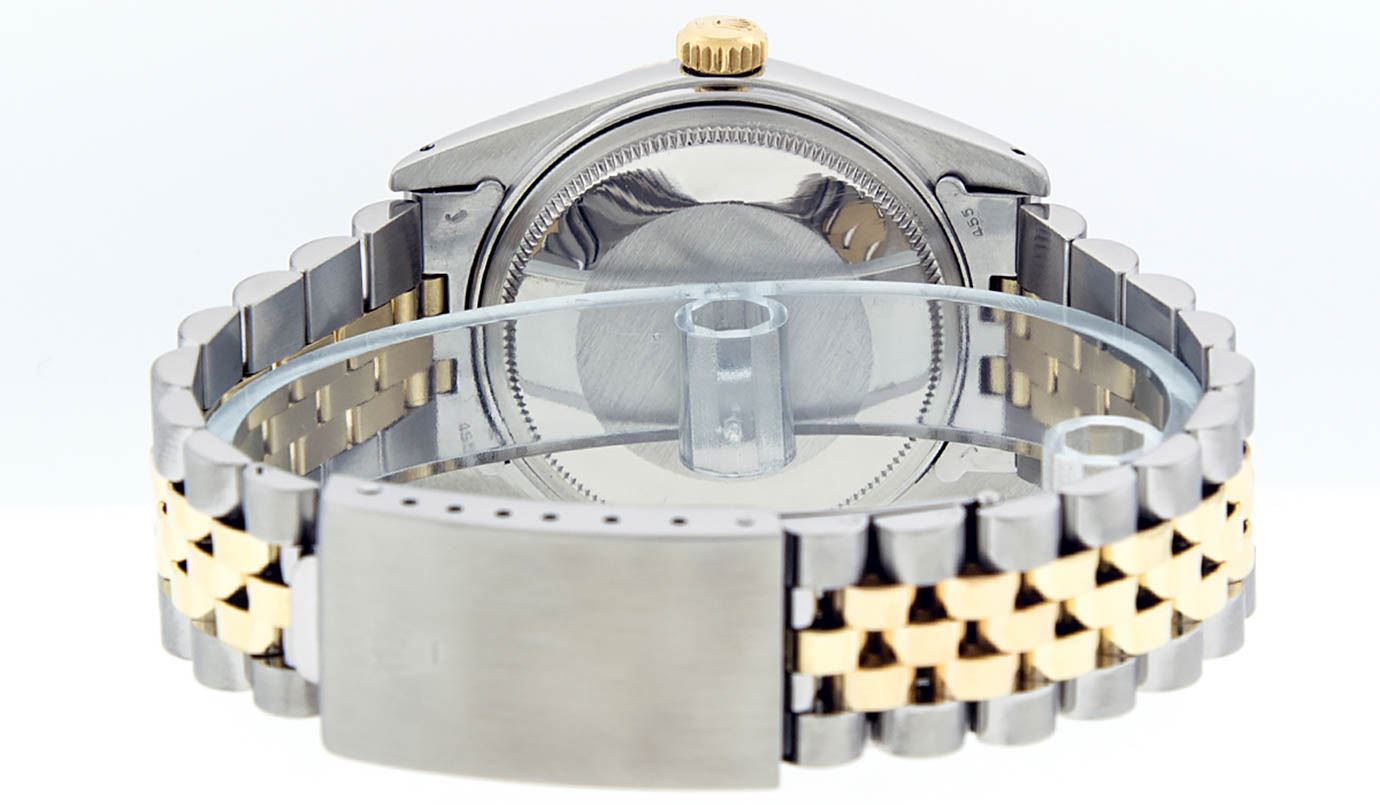 One Mens 14K Yellow Gold Two Tone Rolex Datejust Polished, Serviced & Electronically Tested, 14K Yellow Gold & Stainless Steel Case: 36mm,14K Yellow Gold Crown, Bezel: 14K Yellow Gold Fluted Bezel. Custom Crystal: New Acrylic Cyclops Lens. Custom Hands: New Luminecent Hands. Movement: Automatic Winding Movement Caliber 3035. Custom Dial: Mother Of Pearl Roman With Square Track. Date Window: 3 O'Clock Position Date Display, Quickset, Model: 16013 Datejust. Condition: G-6 Extra Fine. Bracelet:Two Tone 14K Yellow Gold & Stainless Steel Jubilee. Bright Polish. 7.0 Inch Length, Adjustable. Standard Clasp, With Rolex Logo. This Watch Has Been Serviced Time Tested And Is In Excellent Condition It Is Free Of All Scratches And Dents.