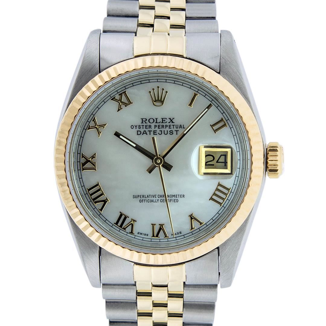 One Mens 14K Yellow Gold Two Tone Rolex Datejust Polished, Serviced & Electronically Tested, 14K Yellow Gold & Stainless Steel Case: 36mm,14K Yellow Gold Crown, Bezel: 14K Yellow Gold Fluted Bezel. Custom Crystal: New Acrylic Cyclops Lens. Custom Hands: New Luminecent Hands. Movement: Automatic Winding Movement Caliber 3035. Custom Dial: Mother Of Pearl Roman With Square Track. Date Window: 3 O'Clock Position Date Display, Quickset, Model: 16013 Datejust. Condition: G-6 Extra Fine. Bracelet:Two Tone 14K Yellow Gold & Stainless Steel Jubilee. Bright Polish. 7.0 Inch Length, Adjustable. Standard Clasp, With Rolex Logo. This Watch Has Been Serviced Time Tested And Is In Excellent Condition It Is Free Of All Scratches And Dents.