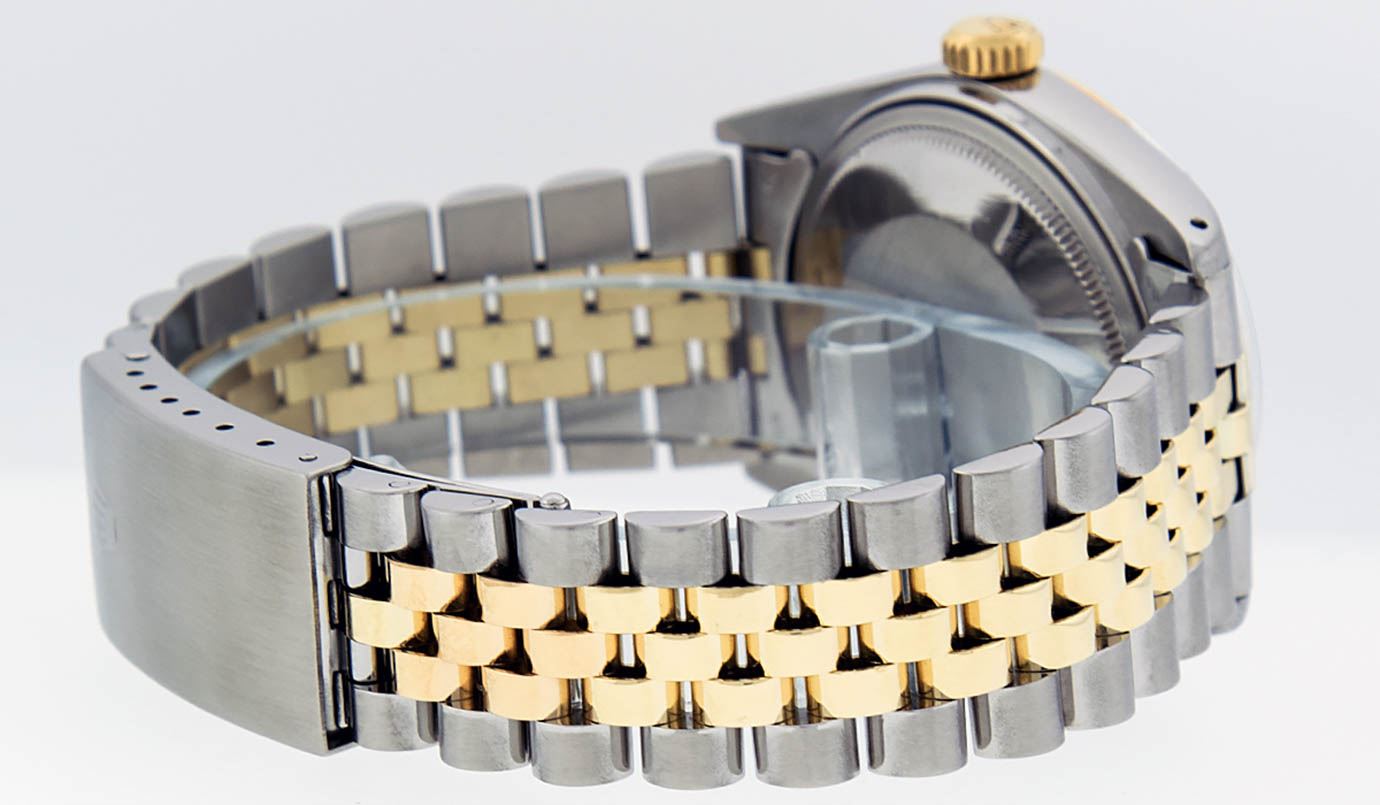 One Mens 14K Yellow Gold Two Tone Rolex Datejust Polished, Serviced & Electronically Tested, 14K Yellow Gold & Stainless Steel Case: 36mm,14K Yellow Gold Crown, Bezel: 14K Yellow Gold Fluted Bezel. Custom Crystal: New Acrylic Cyclops Lens. Custom Hands: New Luminecent Hands. Movement: Automatic Winding Movement Caliber 3035. Custom Dial: Mother Of Pearl Roman With Square Track. Date Window: 3 O'Clock Position Date Display, Quickset, Model: 16013 Datejust. Condition: G-6 Extra Fine. Bracelet:Two Tone 14K Yellow Gold & Stainless Steel Jubilee. Bright Polish. 7.0 Inch Length, Adjustable. Standard Clasp, With Rolex Logo. This Watch Has Been Serviced Time Tested And Is In Excellent Condition It Is Free Of All Scratches And Dents.