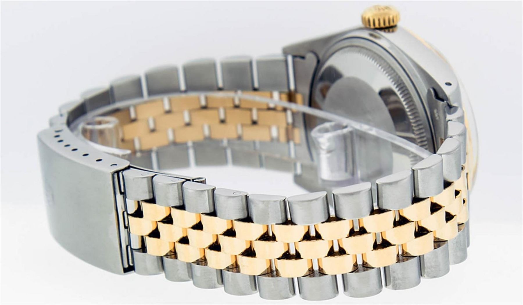 One Mens 14K Yellow Gold Two Tone Rolex Datejust Polished, Serviced & Electronically Tested, 14K Yellow Gold & Stainless Steel Case: 36mm,14K Yellow Gold Crown, Bezel: 14K Yellow Gold Fluted Bezel. Custom Crystal: New Acrylic Cyclops Lens. Custom Hands: New Luminecent Hands. Movement: Automatic Winding Movement Caliber 3035. Custom Dial: Mother Of Pearl Roman With Square Track. Date Window: 3 O'Clock Position Date Display, Quickset, Model: 16013 Datejust. Condition: G-6 Extra Fine. Bracelet:Two Tone 14K Yellow Gold & Stainless Steel Jubilee. Bright Polish. 7.0 Inch Length, Adjustable. Standard Clasp, With Rolex Logo. This Watch Has Been Serviced Time Tested And Is In Excellent Condition It Is Free Of All Scratches And Dents.