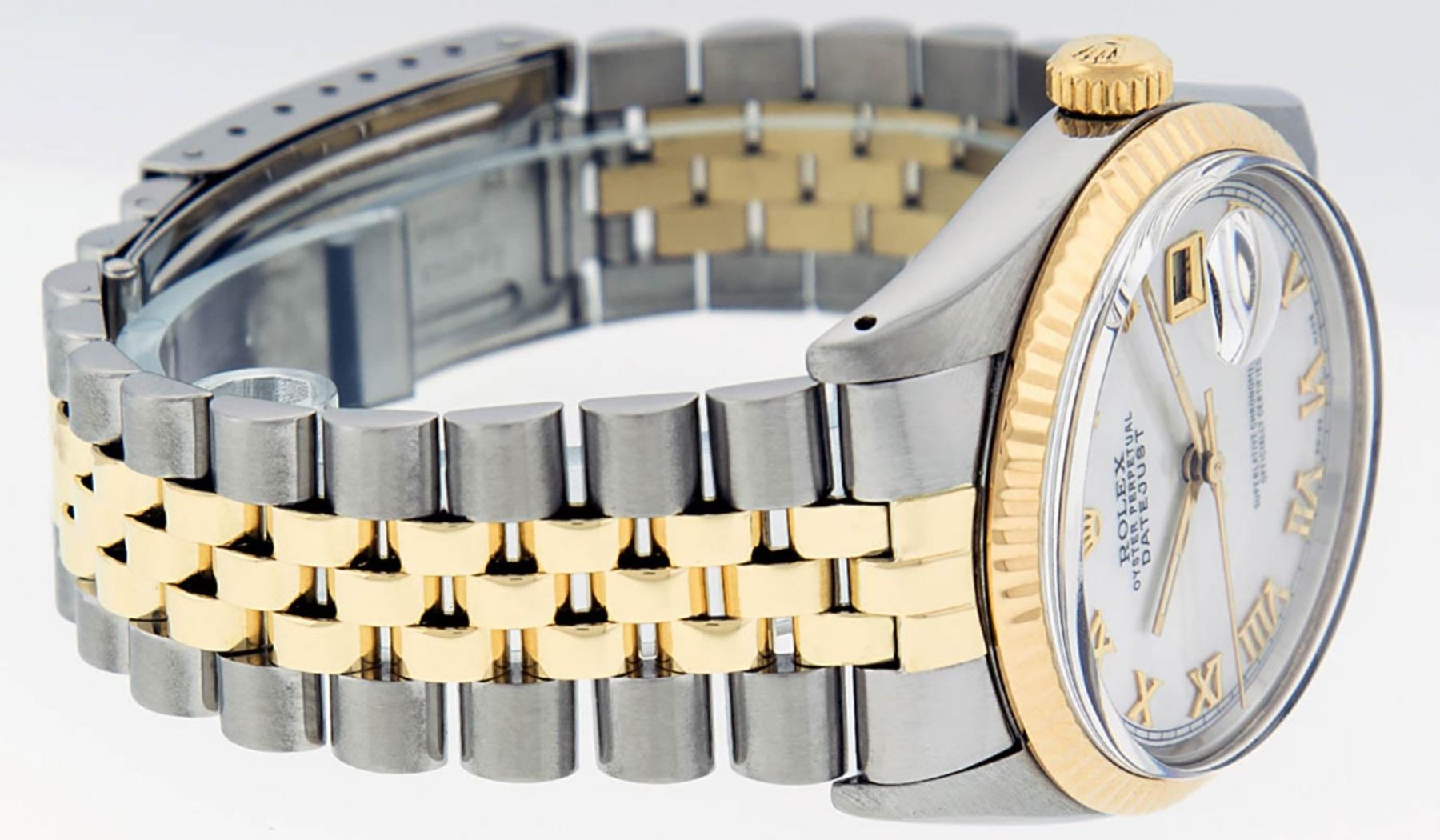 One Mens 14K Yellow Gold Two Tone Rolex Datejust Polished, Serviced & Electronically Tested, 14K Yellow Gold & Stainless Steel Case: 36mm,14K Yellow Gold Crown, Bezel: 14K Yellow Gold Fluted Bezel. Custom Crystal: New Acrylic Cyclops Lens. Custom Hands: New Luminecent Hands. Movement: Automatic Winding Movement Caliber 3035. Custom Dial: Mother Of Pearl Roman With Square Track. Date Window: 3 O'Clock Position Date Display, Quickset, Model: 16013 Datejust. Condition: G-6 Extra Fine. Bracelet:Two Tone 14K Yellow Gold & Stainless Steel Jubilee. Bright Polish. 7.0 Inch Length, Adjustable. Standard Clasp, With Rolex Logo. This Watch Has Been Serviced Time Tested And Is In Excellent Condition It Is Free Of All Scratches And Dents.