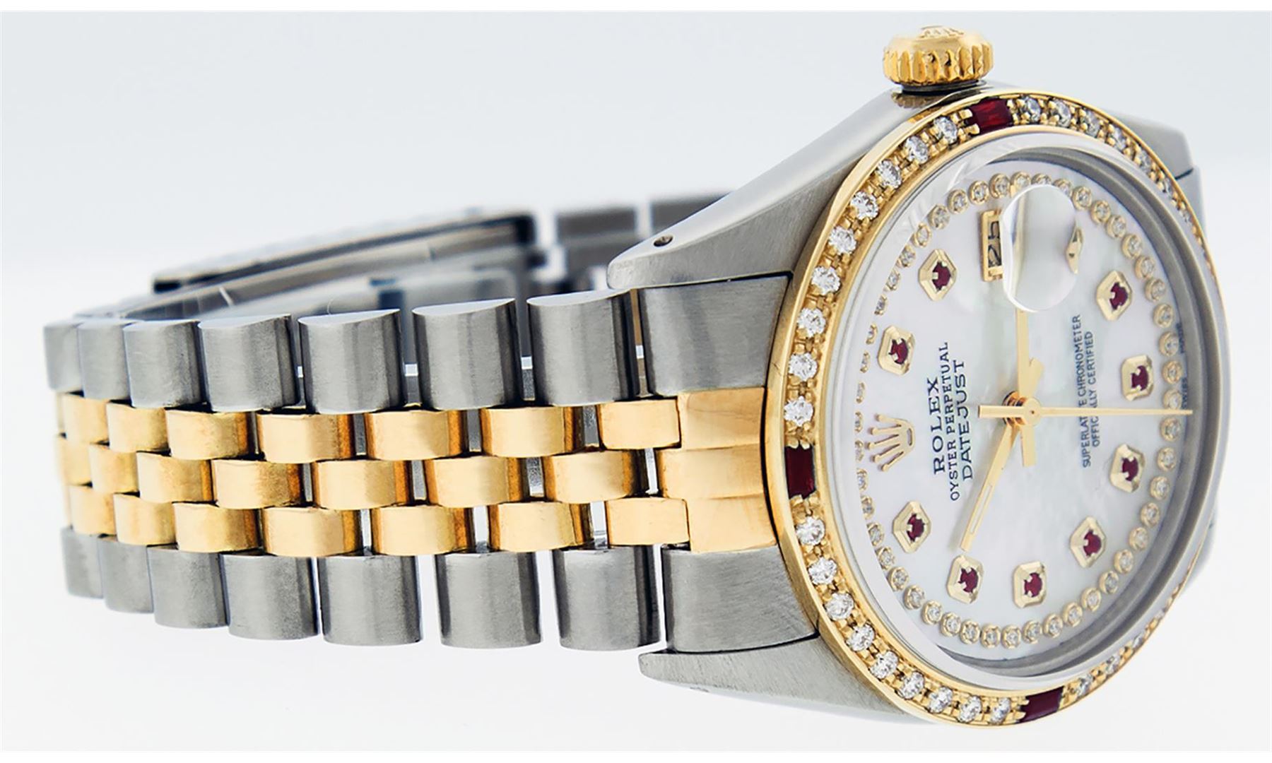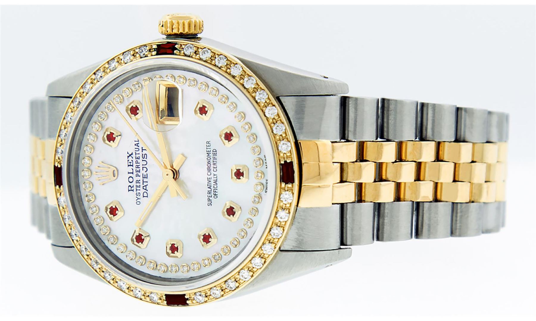 One Mens 14K Yellow Gold Two Tone Rolex Datejust Polished, Serviced & Electronically Tested, 14K Yellow Gold & Stainless Steel Case: 36mm, 14K Yellow Gold Crown, Custom Bezel: New 18K Yellow Gold Ruby Beadset Diamond Bezel, Diamond Count: 36 Diamonds + 4 Rubies, Total Weight 1.00 Carat, Clarity: SI-VS, Color: G to H. Custom Crystal: New Scratch Resistant Synthetic Sapphire Cyclops Lens. Custom Hands: New Luminecent Hands. Movement: Automatic Winding Movement Caliber 3035. Custom Dial: Mother Of Pearl Ruby String Diamond Dial, Diamond + Gem Count: 10 Rubies + 48 Diamonds in Dial, G To H In Color, SI-VS Clarity. Date Window: 3 O'Clock Position Date Display, Quickset, Model: 16013 Datejust. Condition: G-6 Extra Fine. Bracelet: Two Tone 14K Yellow Gold & Stainless Steel Jubilee. Bright Polish. 7.0 Inch Length, Adjustable. Standard Clasp, With Rolex Logo. This Watch Has Been Serviced Time Tested And Is In Excellent Condition It Is Free Of All Scratches And Dents.
