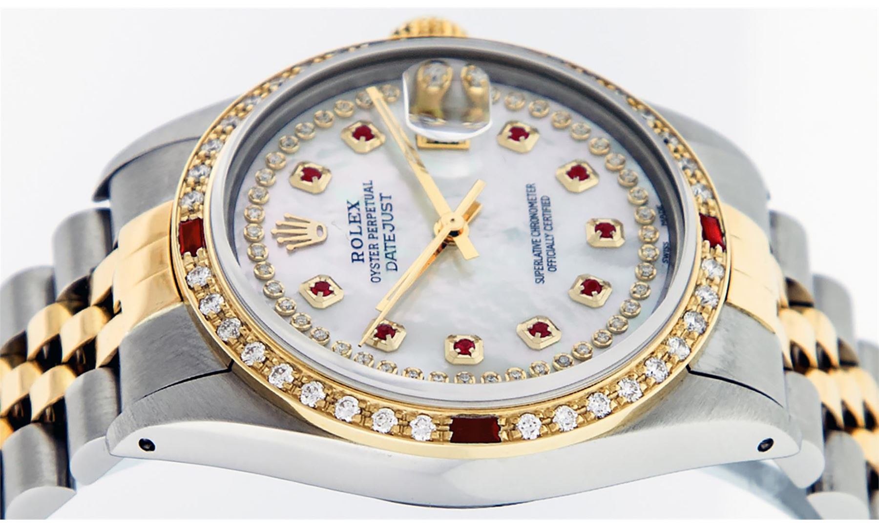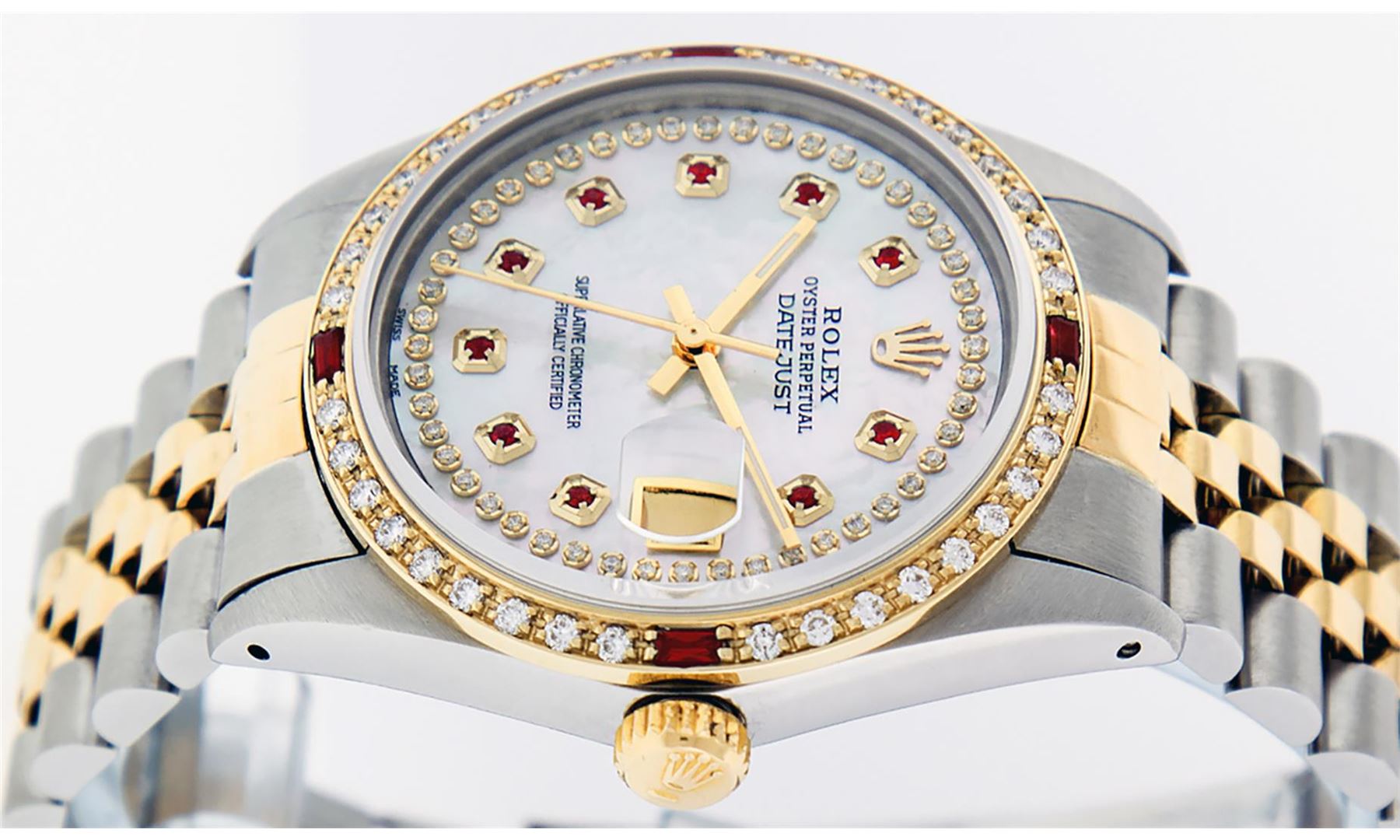 One Mens 14K Yellow Gold Two Tone Rolex Datejust Polished, Serviced & Electronically Tested, 14K Yellow Gold & Stainless Steel Case: 36mm, 14K Yellow Gold Crown, Custom Bezel: New 18K Yellow Gold Ruby Beadset Diamond Bezel, Diamond Count: 36 Diamonds + 4 Rubies, Total Weight 1.00 Carat, Clarity: SI-VS, Color: G to H. Custom Crystal: New Scratch Resistant Synthetic Sapphire Cyclops Lens. Custom Hands: New Luminecent Hands. Movement: Automatic Winding Movement Caliber 3035. Custom Dial: Mother Of Pearl Ruby String Diamond Dial, Diamond + Gem Count: 10 Rubies + 48 Diamonds in Dial, G To H In Color, SI-VS Clarity. Date Window: 3 O'Clock Position Date Display, Quickset, Model: 16013 Datejust. Condition: G-6 Extra Fine. Bracelet: Two Tone 14K Yellow Gold & Stainless Steel Jubilee. Bright Polish. 7.0 Inch Length, Adjustable. Standard Clasp, With Rolex Logo. This Watch Has Been Serviced Time Tested And Is In Excellent Condition It Is Free Of All Scratches And Dents.
