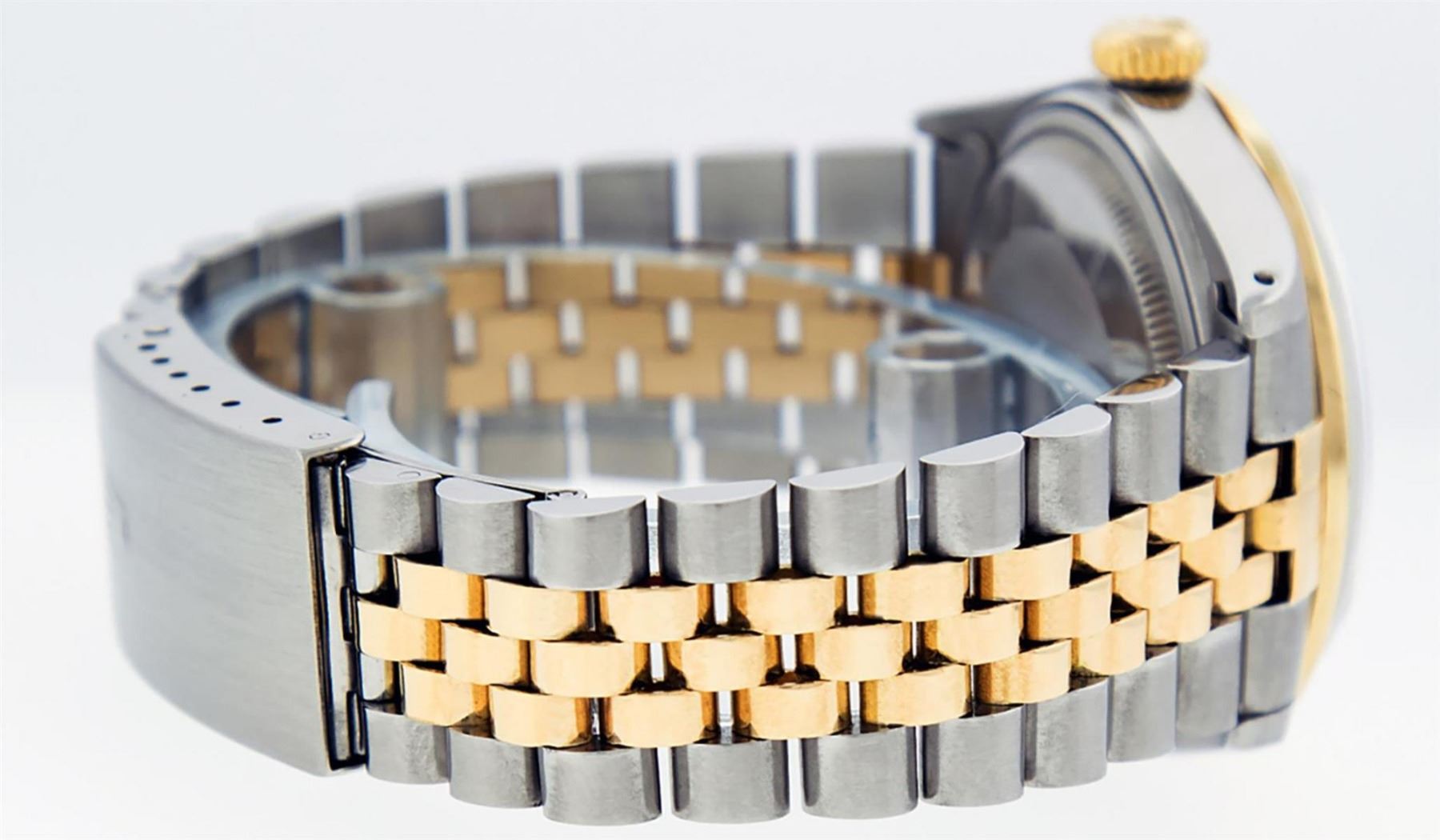 One Mens 14K Yellow Gold Two Tone Rolex Datejust Polished, Serviced & Electronically Tested, 14K Yellow Gold & Stainless Steel Case: 36mm, 14K Yellow Gold Crown, Custom Bezel: New 18K Yellow Gold Ruby Beadset Diamond Bezel, Diamond Count: 36 Diamonds + 4 Rubies, Total Weight 1.00 Carat, Clarity: SI-VS, Color: G to H. Custom Crystal: New Scratch Resistant Synthetic Sapphire Cyclops Lens. Custom Hands: New Luminecent Hands. Movement: Automatic Winding Movement Caliber 3035. Custom Dial: Mother Of Pearl Ruby String Diamond Dial, Diamond + Gem Count: 10 Rubies + 48 Diamonds in Dial, G To H In Color, SI-VS Clarity. Date Window: 3 O'Clock Position Date Display,� Quickset, Model: 16013 Datejust. Condition: G-6 Extra Fine. Bracelet: Two Tone 14K Yellow Gold & Stainless Steel Jubilee. Bright Polish.�7.0 Inch Length, Adjustable. Standard Clasp, With Rolex Logo. This Watch Has Been Serviced Time Tested And Is In Excellent Condition It Is Free Of All Scratches And Dents.