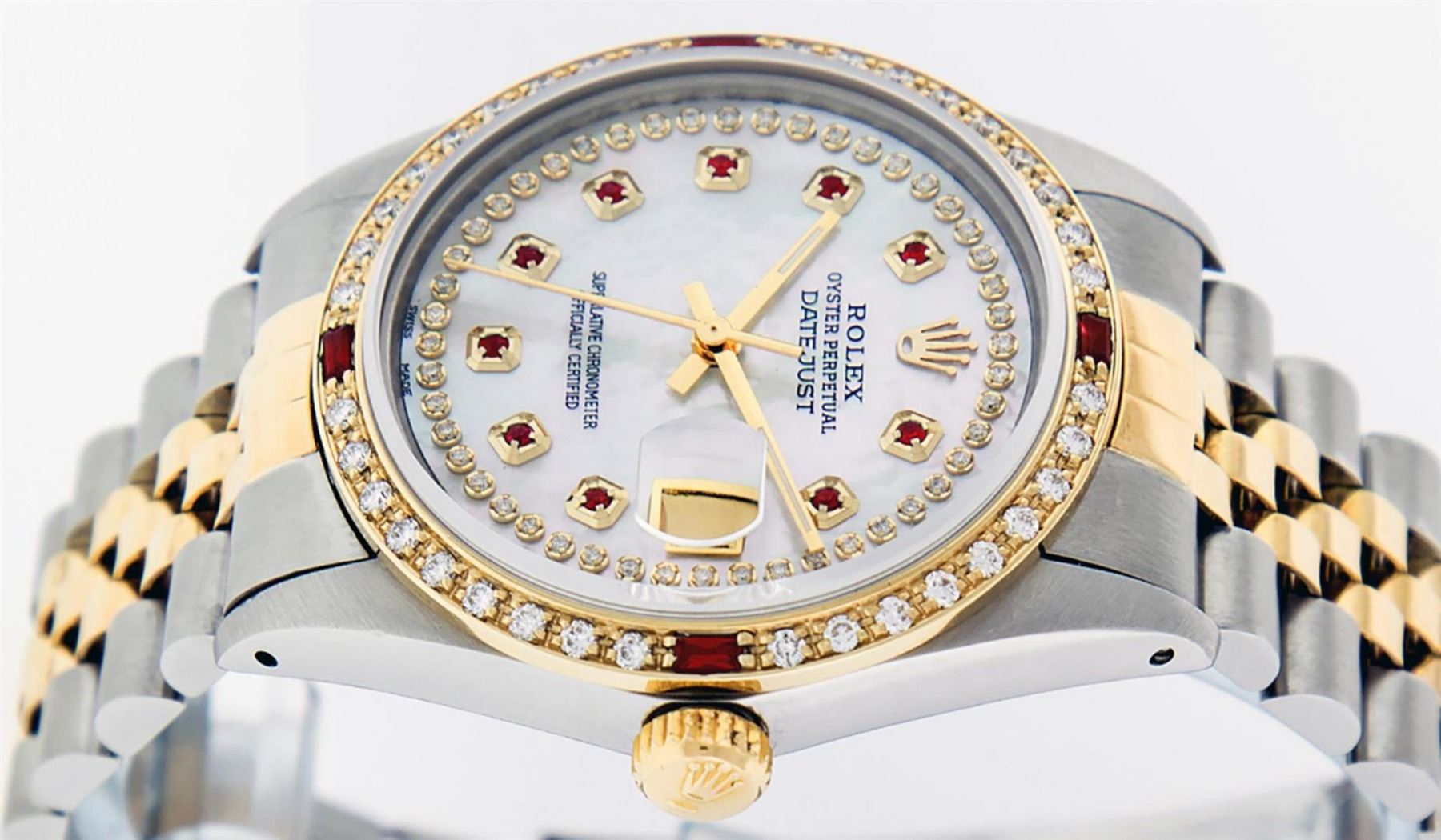 One Mens 14K Yellow Gold Two Tone Rolex Datejust Polished, Serviced & Electronically Tested, 14K Yellow Gold & Stainless Steel Case: 36mm, 14K Yellow Gold Crown, Custom Bezel: New 18K Yellow Gold Ruby Beadset Diamond Bezel, Diamond Count: 36 Diamonds + 4 Rubies, Total Weight 1.00 Carat, Clarity: SI-VS, Color: G to H. Custom Crystal: New Scratch Resistant Synthetic Sapphire Cyclops Lens. Custom Hands: New Luminecent Hands. Movement: Automatic Winding Movement Caliber 3035. Custom Dial: Mother Of Pearl Ruby String Diamond Dial, Diamond + Gem Count: 10 Rubies + 48 Diamonds in Dial, G To H In Color, SI-VS Clarity. Date Window: 3 O'Clock Position Date Display, Quickset, Model: 16013 Datejust. Condition: G-6 Extra Fine. Bracelet: Two Tone 14K Yellow Gold & Stainless Steel Jubilee. Bright Polish. 7.0 Inch Length, Adjustable. Standard Clasp, With Rolex Logo. This Watch Has Been Serviced Time Tested And Is In Excellent Condition It Is Free Of All Scratches And Dents.