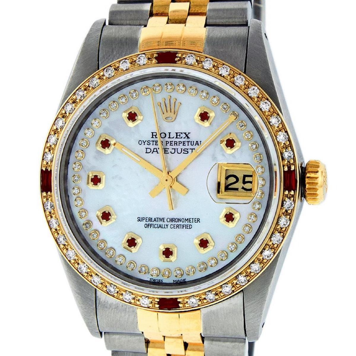 One Mens 14K Yellow Gold Two Tone Rolex Datejust Polished, Serviced & Electronically Tested, 14K Yellow Gold & Stainless Steel Case: 36mm, 14K Yellow Gold Crown, Custom Bezel: New 18K Yellow Gold Ruby Beadset Diamond Bezel, Diamond Count: 36 Diamonds + 4 Rubies, Total Weight 1.00 Carat, Clarity: SI-VS, Color: G to H. Custom Crystal: New Scratch Resistant Synthetic Sapphire Cyclops Lens. Custom Hands: New Luminecent Hands. Movement: Automatic Winding Movement Caliber 3035. Custom Dial: Mother Of Pearl Ruby String Diamond Dial, Diamond + Gem Count: 10 Rubies + 48 Diamonds in Dial, G To H In Color, SI-VS Clarity. Date Window: 3 O'Clock Position Date Display, Quickset, Model: 16013 Datejust. Condition: G-6 Extra Fine. Bracelet: Two Tone 14K Yellow Gold & Stainless Steel Jubilee. Bright Polish. 7.0 Inch Length, Adjustable. Standard Clasp, With Rolex Logo. This Watch Has Been Serviced Time Tested And Is In Excellent Condition It Is Free Of All Scratches And Dents.