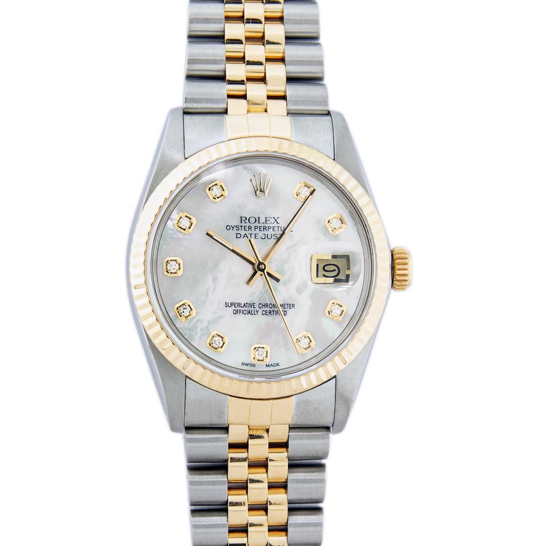 One Mens 14K Yellow Gold Two Tone Rolex Datejust Polished, Serviced & Electronically Tested, 14K Yellow Gold & Stainless Steel Case: 36mm, 14K Yellow Gold Crown,�Bezel: 18K Yellow Gold�Fluted Bezel. Custom Crystal: New Acrylic Cyclops Lens. Custom Hands: New Hands. Movement: Automatic Winding Movement Caliber 3035. Custom Dial: Mother Of Pearl Dial Set With Diamond Hour Markers,�Diamond Count: 10 Diamonds�in Dial G To H In Color, VS Clarity. Date Window: 3 O'Clock Position Date Display,�Quickset, Model: 16013 Condition: G-6 Extra Fine. Bracelet: Two Tone 14K Yellow Gold & Stainless Steel Jubilee. Bright Polish.�7.0 Inch Length, Adjustable. Standard Clasp, With Rolex Logo. Watch Has Been Serviced And Polished It Is Free Of All Scratches And Dents. This Watch Has Been Serviced Time Tested And Is In Excellent Condition It Is Free Of All Scratches And Dents. This Watch Comes With A Rolex Box.