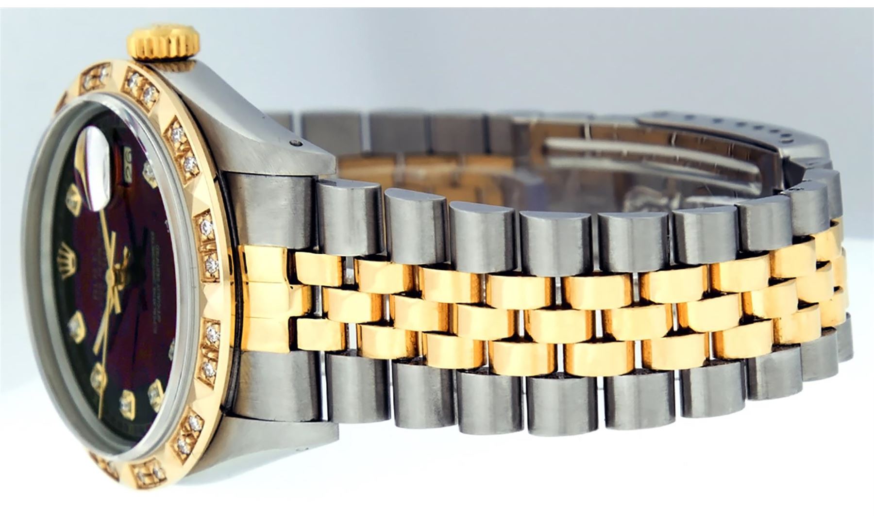 One Mens 14K Yellow Gold Rolex Datejust Polished Bright with Satin Finish, Serviced & Electronically Tested, Stainless Steel Case: 36mm, Yellow Gold Crown, Custom Bezel: New 18K Yellow Gold Pyramid Diamond Bezel, Diamond Count: 24 Diamonds, Total Weight .75 Carat, Clarity: SI-VS, Color: G to H. Custom Crystal: New Scratch Resistant Synthetic Sapphire Cyclops Lens. Custom Hands: New Luminecent Hands. Movement: Automatic Winding Movement Caliber 3035. Custom Dial: Red Vignette Diamond Dial, Diamond Count: 10 Diamonds In Dial, Color: G to H, Clarity: VS. Date Window: 3 O'Clock Position Date Display, Quickset, Model: Datejust. Condition: G-6 Extra Fine. Bracelet: 14K Yellow Gold And Stainless Steel Jubilee Band. Bright Polish & Satin Finish. 7.0 Inch Length, Adjustable. Standard Clasp, With Rolex Logo. This Watch Has Been Serviced And Polished It Is Free Of All Scratches And Dents.