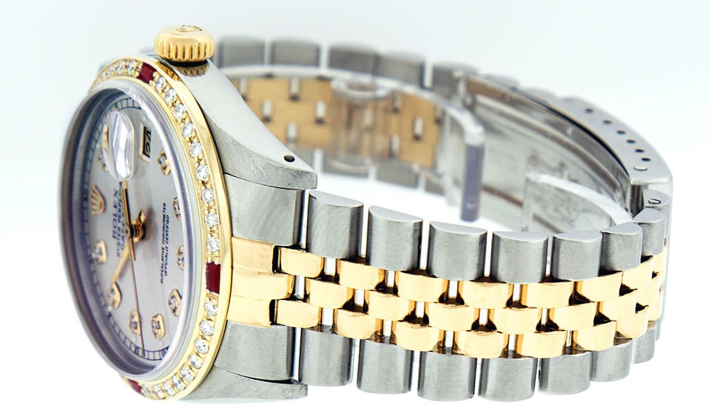 One Mens 14K Yellow Gold Two Tone Rolex Datejust Polished, Fully Serviced & Electronically Tested, 14K Yellow Gold & Stainless Steel Case: 36mm, 14K Yellow Gold Crown, Custom Bezel: 18K Yellow Gold Ruby Beadset Diamond Bezel, Diamond Count: 36 Diamonds + 4 Rubies, Total Weight 1.0 Carat, Clarity: Si-VS, Color: G to H. Custom Crystal: New Synthetic Sapphire Cyclops Lens. Custom Hands: New Luminecent Hands. Movement: Automatic Winding Movement Caliber 3035. Custom Dial: Silver Diamond Dial With Square Roman Track and Luminescent Dots , Diamond Count: 10 Diamonds In Dial, Color: G to H, Clarity: SI-VS. Date Window: 3 O'Clock Position Date Display, Quickset, Model: 16013 Datejust. Condition: G-6 Extra Fine. Bracelet: Two Tone 14K Yellow Gold & Stainless Steel Jubilee. Bright Polish. 7.0 Inch Length, Adjustable. Standard Clasp, With Rolex Logo. This Watch Has Been Serviced Time Tested And Is In Excellent Condition It Is Free Of All Scratches And Dents.