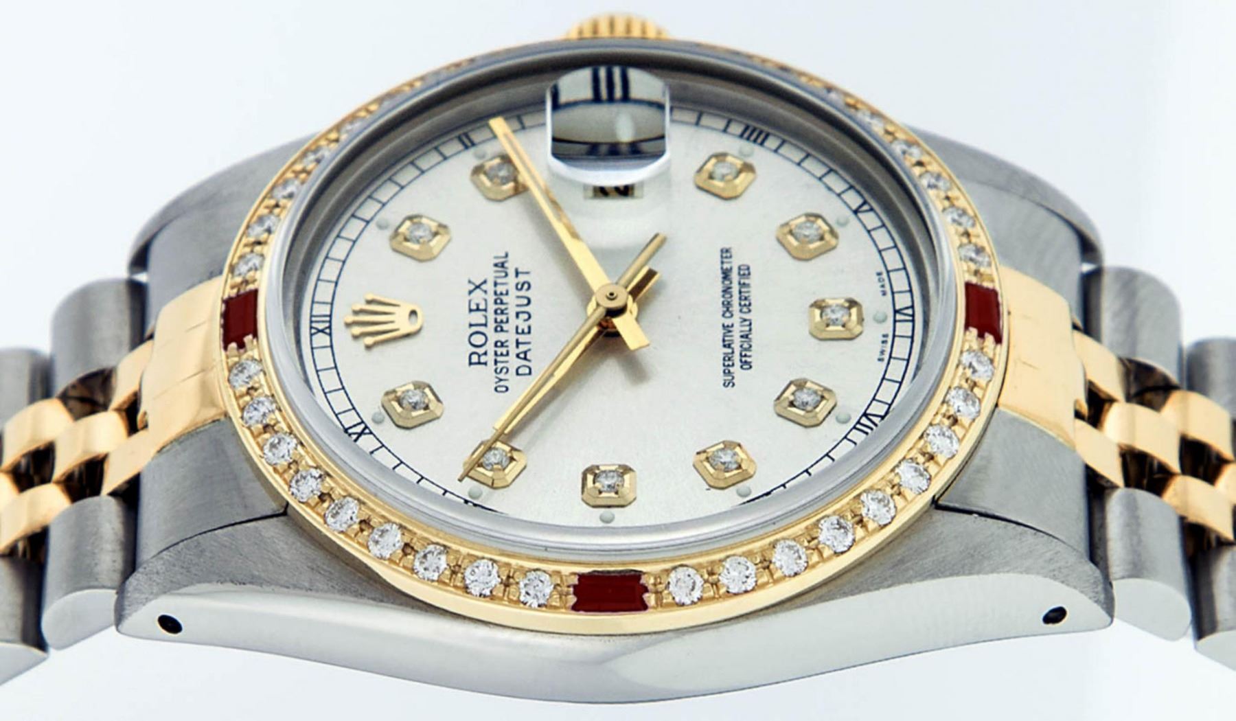 One Mens 14K Yellow Gold Two Tone Rolex Datejust Polished, Fully Serviced & Electronically Tested, 14K Yellow Gold & Stainless Steel Case: 36mm, 14K Yellow Gold Crown, Custom Bezel: 18K Yellow Gold Ruby Beadset Diamond Bezel, Diamond Count: 36 Diamonds + 4 Rubies, Total Weight 1.0 Carat, Clarity: Si-VS, Color: G to H. Custom Crystal: New Synthetic Sapphire Cyclops Lens. Custom Hands: New Luminecent Hands. Movement: Automatic Winding Movement Caliber 3035. Custom Dial: Silver Diamond Dial With Square Roman Track and Luminescent Dots , Diamond Count: 10 Diamonds In Dial, Color: G to H, Clarity: SI-VS. Date Window: 3 O'Clock Position Date Display, Quickset, Model: 16013 Datejust. Condition: G-6 Extra Fine. Bracelet: Two Tone 14K Yellow Gold & Stainless Steel Jubilee. Bright Polish. 7.0 Inch Length, Adjustable. Standard Clasp, With Rolex Logo. This Watch Has Been Serviced Time Tested And Is In Excellent Condition It Is Free Of All Scratches And Dents.