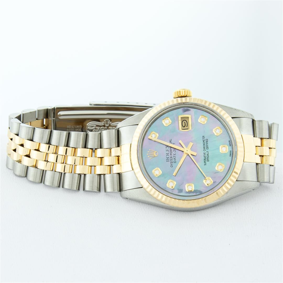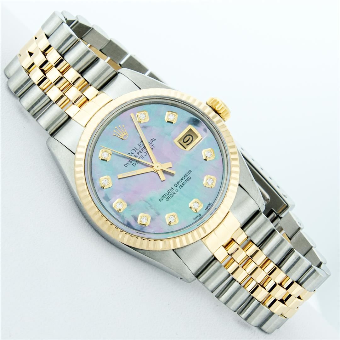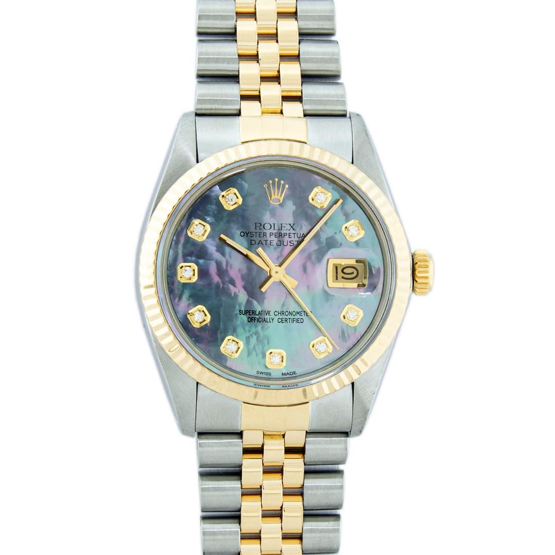 One Mens 14K Yellow Gold Two Tone Rolex Datejust Polished, Serviced & Electronically Tested, 14K Yellow Gold & Stainless Steel Case: 36mm, 14K Yellow Gold Crown, Bezel: 14K Yellow Gold Fluted Bezel. Custom Crystal: New Acrylic Cyclops Lens. Custom Hands: New Luminecent Hands. Movement: Automatic Winding Movement Caliber 3035. Custom Dial: Tahitian Mother Of Pearl Diamond Dial, Stone Count: 10 Diamonds On Dial, G To H In Color, SI-VS Clarity. Date Window: 3 O'Clock Position Date Display, Quickset, Model: Datejust. Condition: G-6 Extra Fine. Bracelet: Two Tone 14K Yellow Gold & Stainless Steel Jubilee. Bright Polish. 7.0 Inch Length, Adjustable. Standard Clasp, With Rolex Logo. This Watch Has Been Serviced And Polished It Is Free Of All Scratches And Dents.