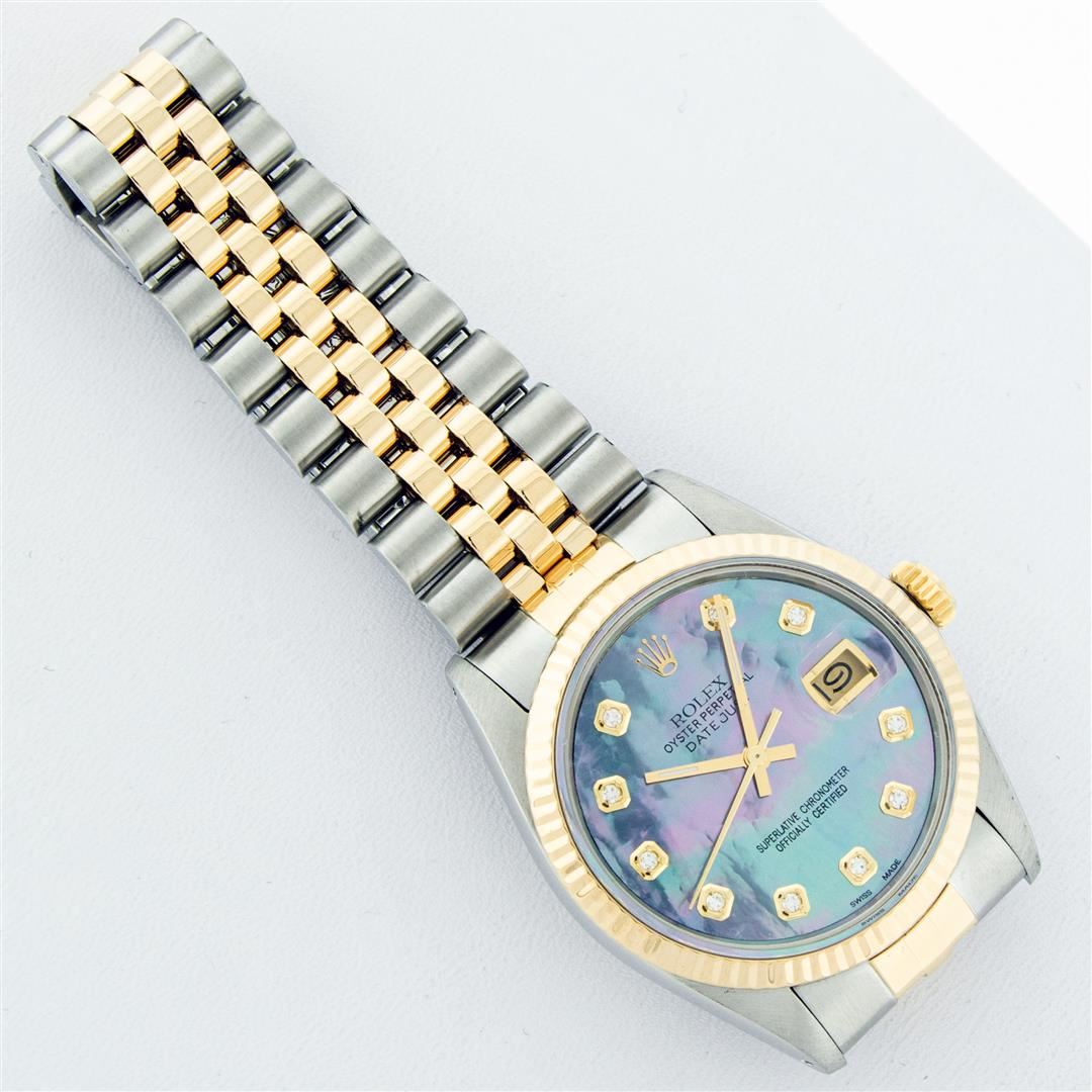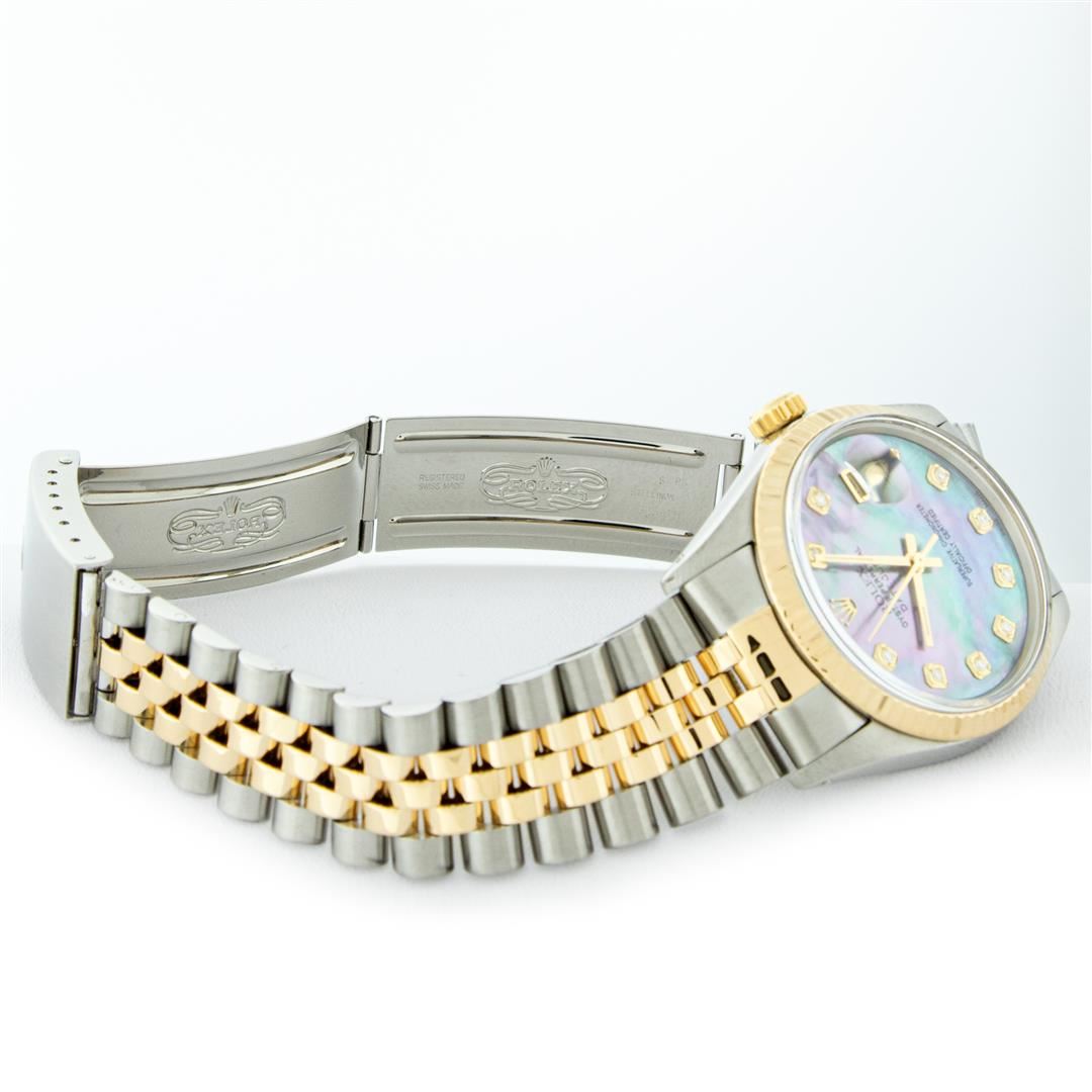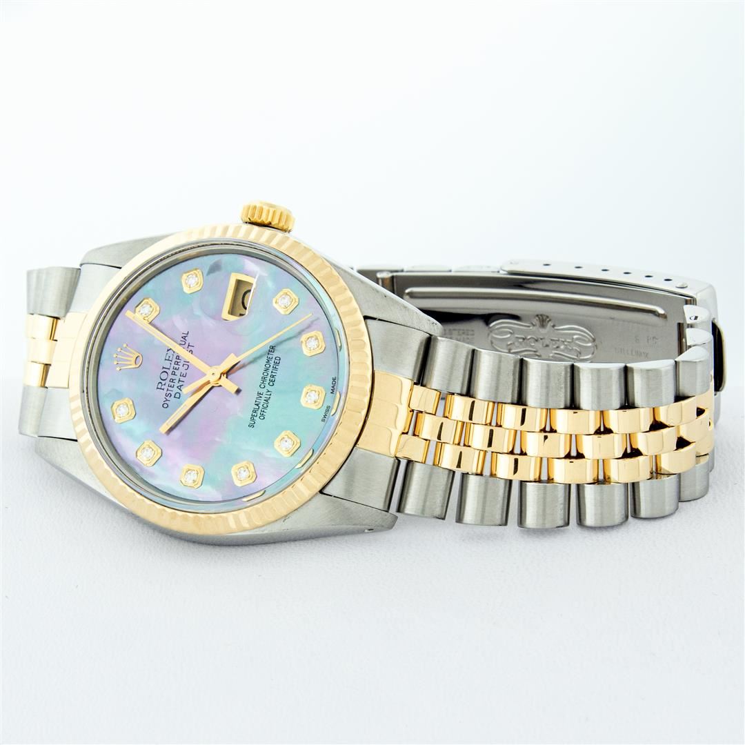 One Mens 14K Yellow Gold Two Tone Rolex Datejust Polished, Serviced & Electronically Tested, 14K Yellow Gold & Stainless Steel Case: 36mm, 14K Yellow Gold Crown, Bezel: 14K Yellow Gold Fluted Bezel. Custom Crystal: New Acrylic Cyclops Lens. Custom Hands: New Luminecent Hands. Movement: Automatic Winding Movement Caliber 3035. Custom Dial: Tahitian Mother Of Pearl Diamond Dial, Stone Count: 10 Diamonds On Dial, G To H In Color, SI-VS Clarity. Date Window: 3 O'Clock Position Date Display, Quickset, Model: Datejust. Condition: G-6 Extra Fine. Bracelet: Two Tone 14K Yellow Gold & Stainless Steel Jubilee. Bright Polish. 7.0 Inch Length, Adjustable. Standard Clasp, With Rolex Logo. This Watch Has Been Serviced And Polished It Is Free Of All Scratches And Dents.