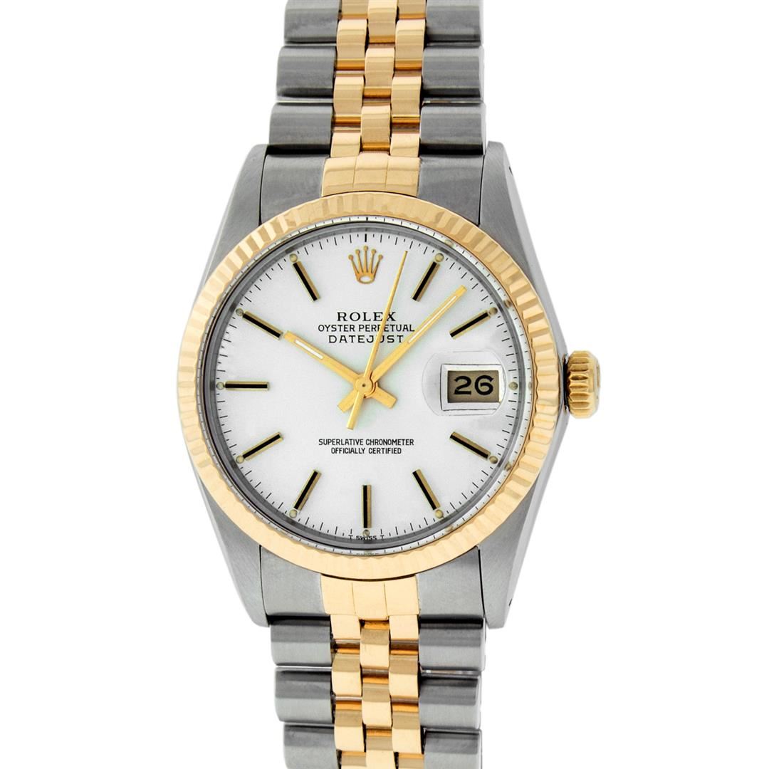 One Mens 14K Yellow Gold Two Tone Rolex Datejust Polished, Serviced & Electronically Tested, 14K Yellow Gold & Stainless Steel Case: 36mm,14K Yellow Gold Crown, Bezel: 14K Yellow Gold Fluted Bezel. Custom Crystal: New Acrylic Cyclops Lens. Custom Hands: New Luminecent Hands. Movement: Automatic Winding Movement Caliber 3035. Dial: White Index With Index Hour Markers and Small Track With Lumi Dots. Date Window: 3 O'Clock Position Date Display, Quickset, Model: Datejust. Condition: G-6 Extra Fine. Bracelet: Two Tone 14K Yellow Gold & Stainless Steel Jubilee Band. Bright Polish. 7.0 Inch Length, Adjustable. Standard Clasp, With Rolex Logo. This Watch Has Been Serviced Time Tested And Is In Excellent Condition It Is Free Of All Scratches And Dents. This Watch Comes With A Rolex Box.