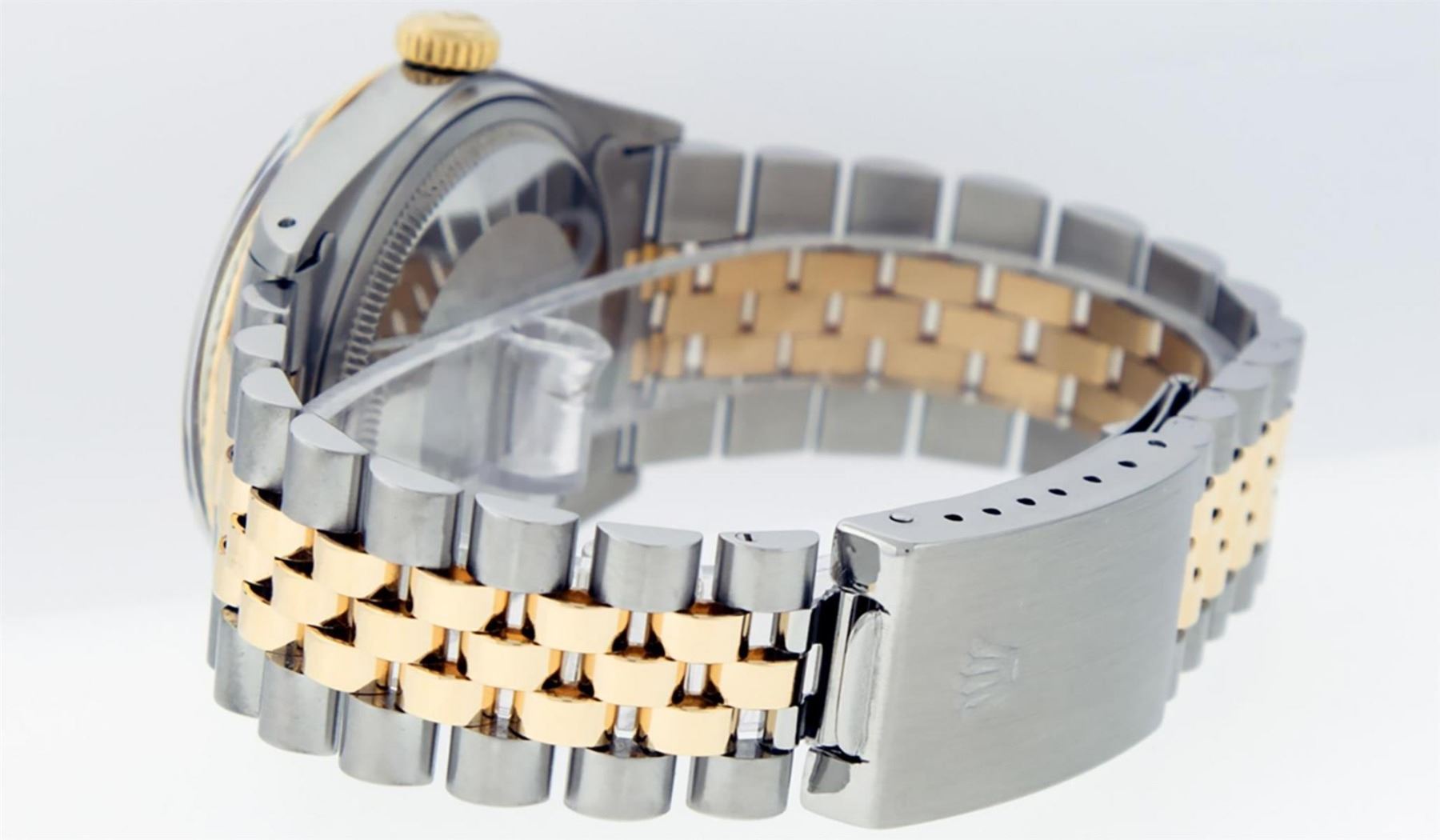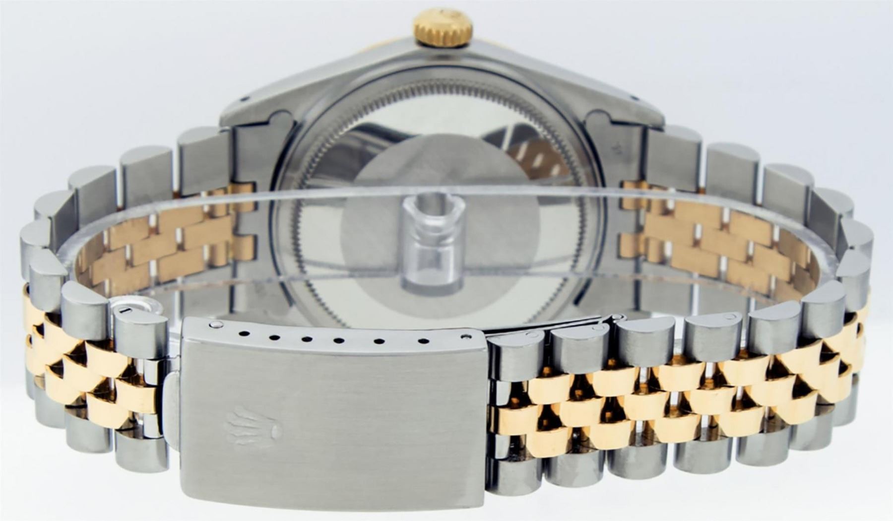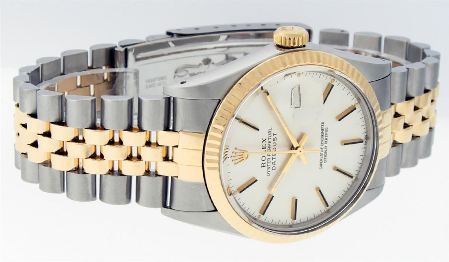 One Mens 14K Yellow Gold Two Tone Rolex Datejust Polished, Serviced & Electronically Tested, 14K Yellow Gold & Stainless Steel Case: 36mm,14K Yellow Gold Crown, Bezel: 14K Yellow Gold Fluted Bezel. Custom Crystal: New Acrylic Cyclops Lens. Custom Hands: New Luminecent Hands. Movement: Automatic Winding Movement Caliber 3035. Dial: White Index With Index Hour Markers and Small Track With Lumi Dots. Date Window: 3 O'Clock Position Date Display, Quickset, Model: Datejust. Condition: G-6 Extra Fine. Bracelet: Two Tone 14K Yellow Gold & Stainless Steel Jubilee Band. Bright Polish. 7.0 Inch Length, Adjustable. Standard Clasp, With Rolex Logo. This Watch Has Been Serviced Time Tested And Is In Excellent Condition It Is Free Of All Scratches And Dents. This Watch Comes With A Rolex Box.