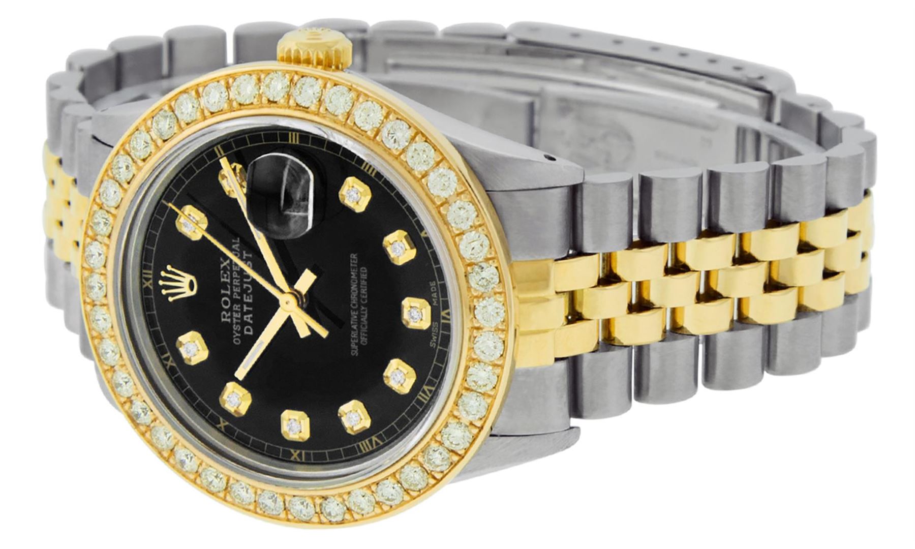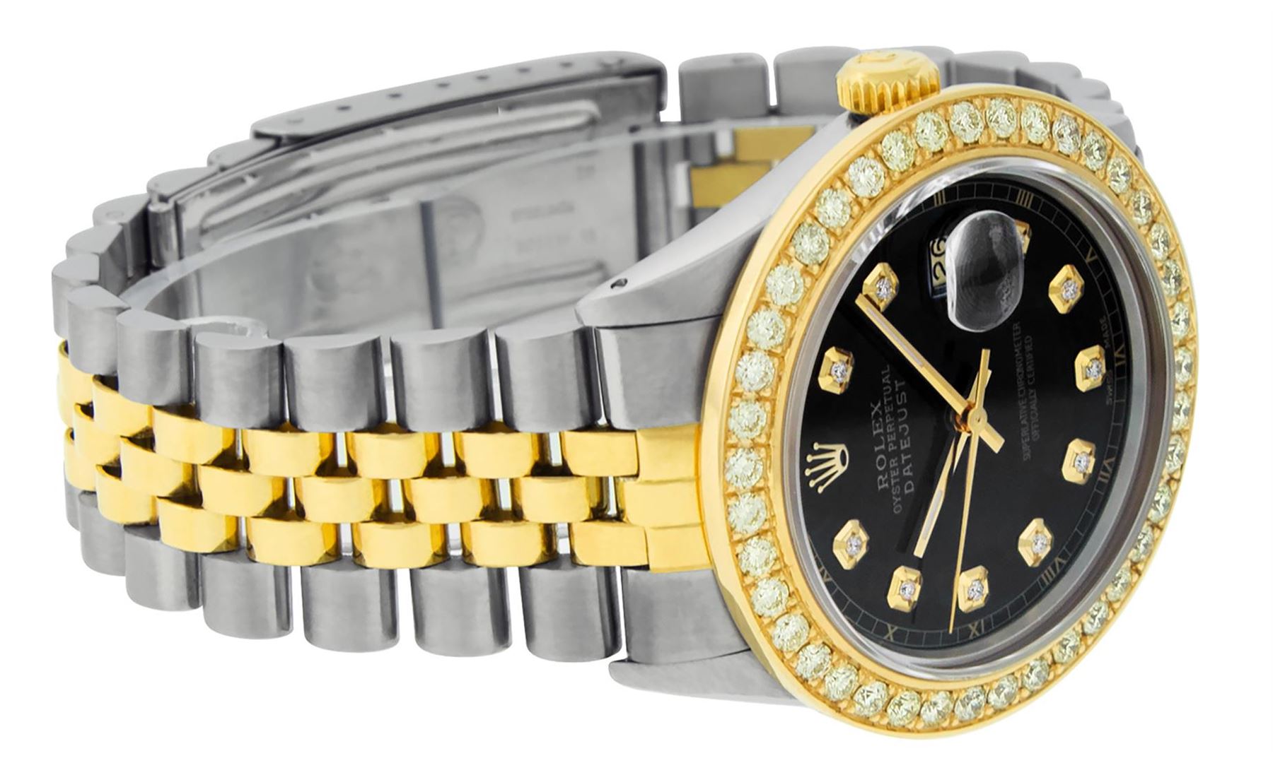 One Mens 14K Yellow Gold Two Tone Rolex Datejust Polished Bright with Satin Finish, Serviced & Electronically Tested, 14K Yellow Gold And Stainless Steel Case: 36mm, Yellow Gold Crown, Custom Bezel: New 18K Yellow Gold Beadset Diamond Bezel, Diamond Count: 40 Diamonds On Bezel, Total Weight 1.9 Carat, Clarity: SI-VS, Color: G to H. Custom Crystal: New Scratch Resistant Synthetic Sapphire Cyclops Lens. Custom Hands: New Luminecent Hands. Movement: Automatic Winding Movement Caliber 3035. Custom Dial: Black Diamond Dial With Roman Track, Diamond Count: 10 Diamonds On Dial, Dial Color: G To H In Color, Clarity: VS2-SI1. Date Window: 3 O'Clock Position Date Display, Quickset, Model: Datejust. Condition: G-6 Extra Fine. Bracelet: 14K Yellow Gold And Stainless Steel Jubilee. Bright Polish & Satin Finish. 7.0 Inch Length, Adjustable. Standard Clasp, With Rolex Logo. This Watch Has Been Serviced and Polished And It Is Free Of All Dents And Scratches And Has Been Time Tested. This Watch Comes With A Rolex Box.
