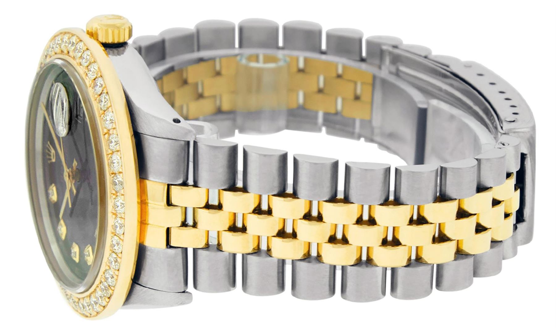 One Mens Pre Owned Yellow Gold Two Tone Rolex Datejust Polished Bright with Satin Finish, Serviced & Electronically Tested, Rolex Yellow Gold And Stainless Steel Case: 36mm, Rolex Yellow Gold Crown, Custom Bezel: New 18K Yellow Gold Bead set Diamond Bezel