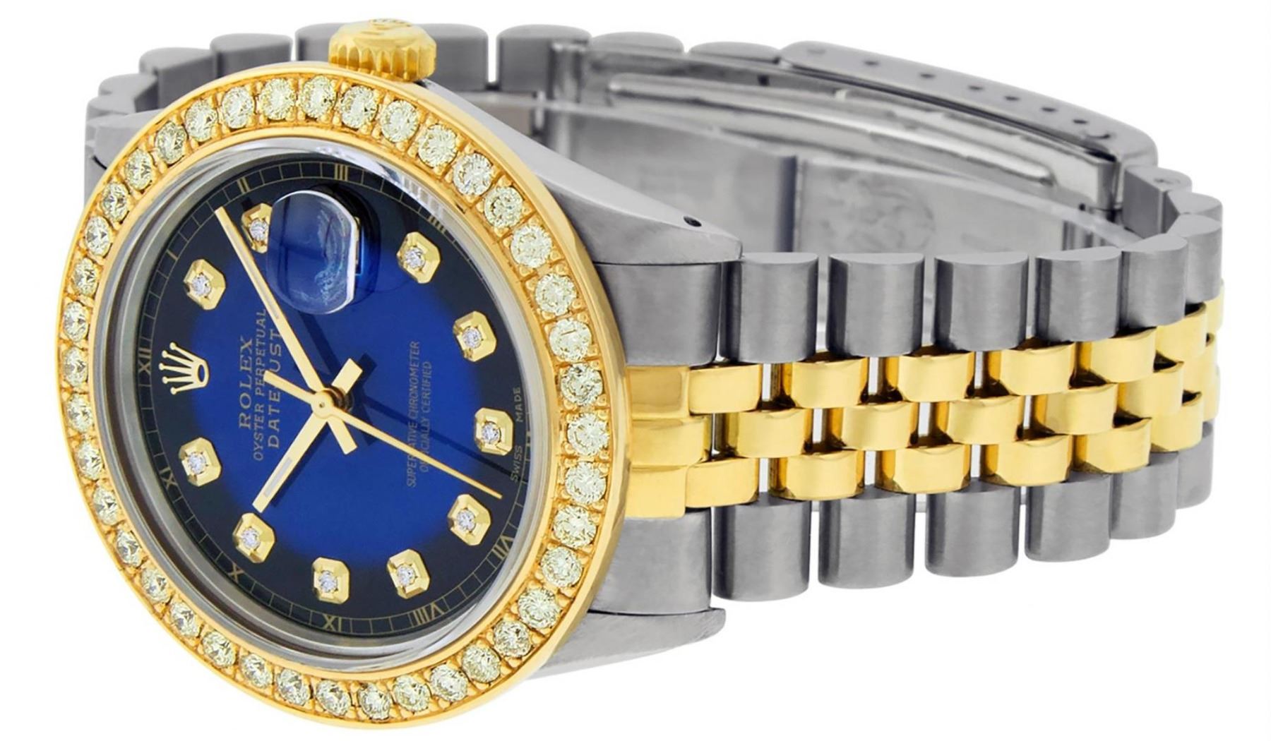 One Mens Yellow Gold Two Tone Rolex Datejust Polished Bright with Satin Finish, Serviced & Electronically Tested, Yellow Gold And Stainless Steel Case: 36mm, Yellow Gold Crown, Custom Bezel: New 18K Yellow Gold Beadset Diamond Bezel, Diamond Count: 40 Diamonds On Bezel, Total Bezel Weight 1.9 Carat, Clarity: SI-VS, Color: G to H. Custom Crystal: New Scratch Resistant Synthetic Sapphire Cyclops Lens. Custom Hands: New Luminecent Hands. Movement: Automatic Winding Movement. Custom Dial: Blue Vignette Diamond Dial With Roman Track, Diamond Count: 10 Diamonds On Dial, Dial Color: G To H In Color, Clarity: VS2-SI1. Date Window: 3 O'Clock Position Date Display, Quickset, Model: Datejust. Condition: G-6 Extra Fine. Bracelet: Yellow Gold And Stainless Steel Jubilee. Bright Polish & Satin Finish. 7.0 Inch Length, Adjustable. Standard Clasp, With Rolex Logo. This Watch Has Been Serviced and Polished And It Is Free Of All Dents And Scratches And Has Been Time Tested.