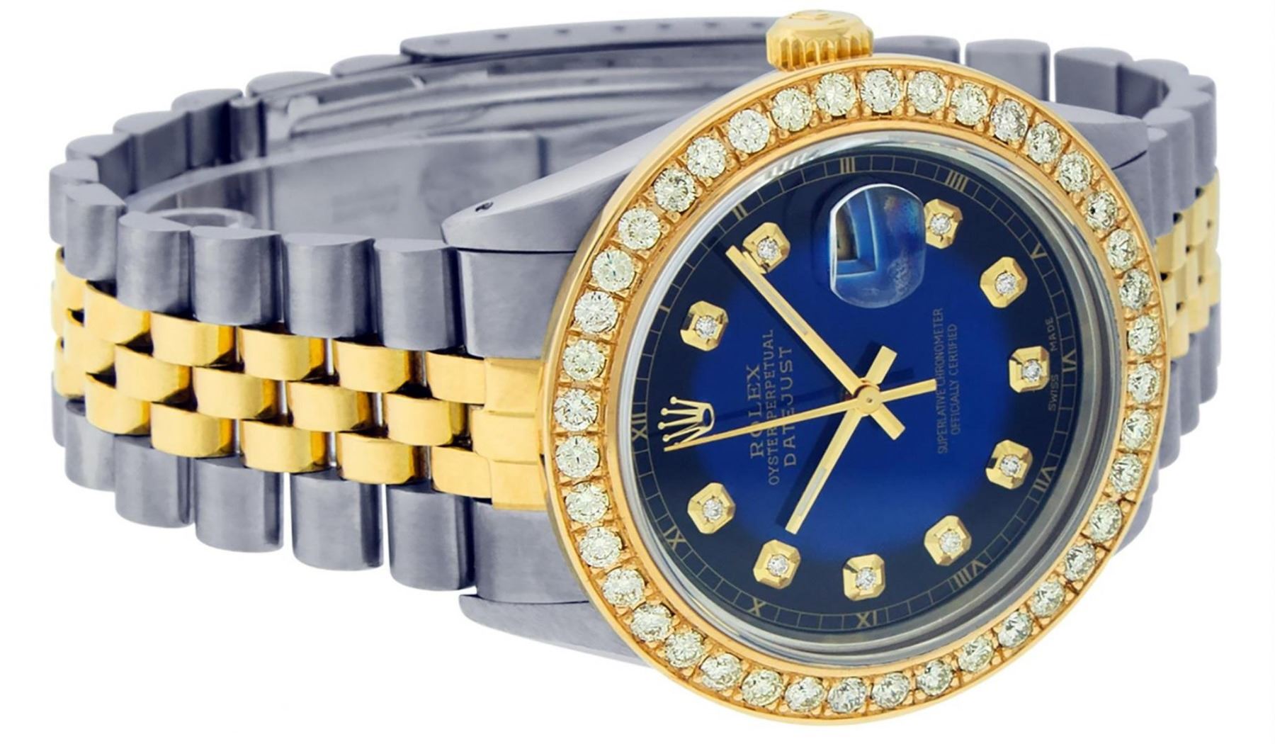 One Mens 14K Yellow Gold Two Tone Rolex Datejust Polished Bright with Satin Finish, Serviced & Electronically Tested, 14K Yellow Gold And Stainless Steel Case: 36mm, Yellow Gold Crown, Custom Bezel: New 18K Yellow Gold Beadset Diamond Bezel, Diamond Count: 40 Diamonds On Bezel, Total Bezel Weight 1.9 Carat, Clarity: SI-VS, Color: G to H. Custom Crystal: New Scratch Resistant Synthetic Sapphire Cyclops Lens. Custom Hands: New Luminecent Hands. Movement: Automatic Winding Movement Caliber 3035. Custom Dial: Blue Vignette Diamond Dial With Roman Track, Diamond Count: 10 Diamonds On Dial, Dial Color: G To H In Color, Clarity: VS2-SI1. Date Window: 3 O'Clock Position Date Display, Quickset, Model: Datejust. Condition: G-6 Extra Fine. Bracelet: 14K Yellow Gold And Stainless Steel Jubilee. Bright Polish & Satin Finish. 7.0 Inch Length, Adjustable. Standard Clasp, With Rolex Logo. This Watch Has Been Serviced and Polished And It Is Free Of All Dents And Scratches And Has Been Time Tested. This Watch Comes With A Rolex Box.