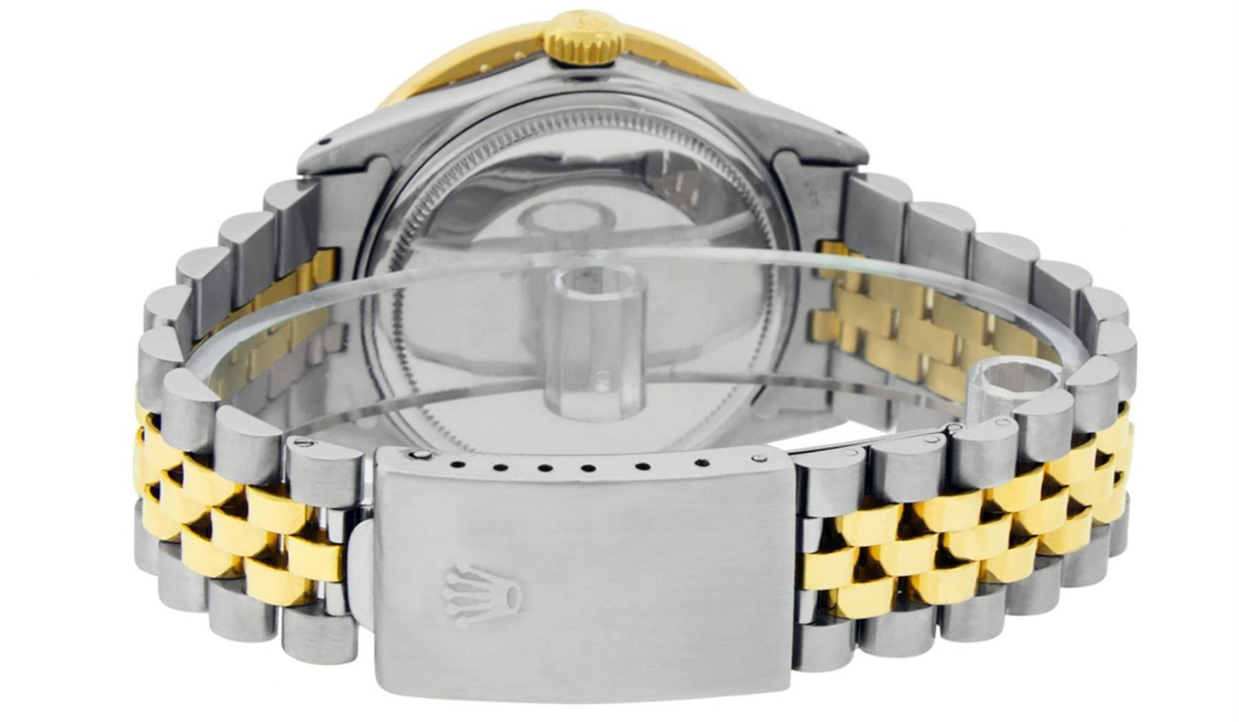 One Mens Yellow Gold Two Tone Rolex Oyster Perpetual Datejust Polished Bright with Satin Finish, Serviced & Electronically Tested, Yellow Gold And Stainless Steel Case: 36mm, Yellow Gold Crown, Custom Bezel: New 18K Yellow Gold Beadset Diamond Bezel, Diamond Count: 40 Diamonds On Bezel, Total Bezel Weight 2.5 Carat, Clarity: SI-VS, Color: G to H. Custom Crystal: New Scratch Resistant Synthetic Sapphire Cyclops Lens. Custom Hands: New Luminecent Hands. Movement: Automatic Winding Movement. Custom Dial: Green Vignette Diamond Dial With Roman Track, Diamond Count: 10 Diamonds On Dial, Dial Color: G To H In Color, Clarity: VS2-SI1. Date Window: 3 O'Clock Position Date Display, Quickset, Model: Datejust. Condition: G-6 Extra Fine. Bracelet: Yellow Gold And Stainless Steel Jubilee Band. Bright Polish & Satin Finish. 7.0 Inch Length, Adjustable. Standard Clasp, With Rolex Logo. This Watch Has Been Serviced and Polished And It Is Free Of All Dents And Scratches And Has Been Time Tested.