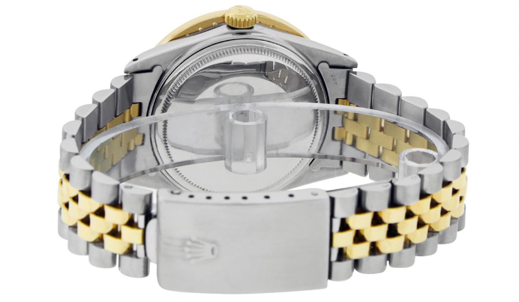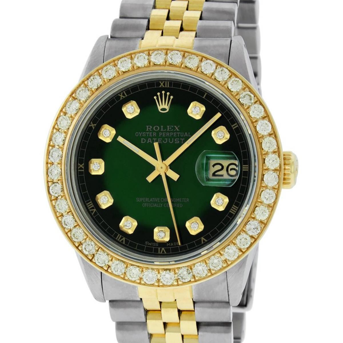 One Mens Yellow Gold Two Tone Rolex Oyster Perpetual Datejust Polished Bright with Satin Finish, Serviced & Electronically Tested, Yellow Gold And Stainless Steel Case: 36mm, Yellow Gold Crown, Custom Bezel: New 18K Yellow Gold Beadset Diamond Bezel, Diamond Count: 40 Diamonds On Bezel, Total Bezel Weight 2.5 Carat, Clarity: SI-VS, Color: G to H. Custom Crystal: New Scratch Resistant Synthetic Sapphire Cyclops Lens. Custom Hands: New Luminecent Hands. Movement: Automatic Winding Movement. Custom Dial: Green Vignette Diamond Dial With Roman Track, Diamond Count: 10 Diamonds On Dial, Dial Color: G To H In Color, Clarity: VS2-SI1. Date Window: 3 O'Clock Position Date Display, Quickset, Model: Datejust. Condition: G-6 Extra Fine. Bracelet: Yellow Gold And Stainless Steel Jubilee Band. Bright Polish & Satin Finish. 7.0 Inch Length, Adjustable. Standard Clasp, With Rolex Logo. This Watch Has Been Serviced and Polished And It Is Free Of All Dents And Scratches And Has Been Time Tested.