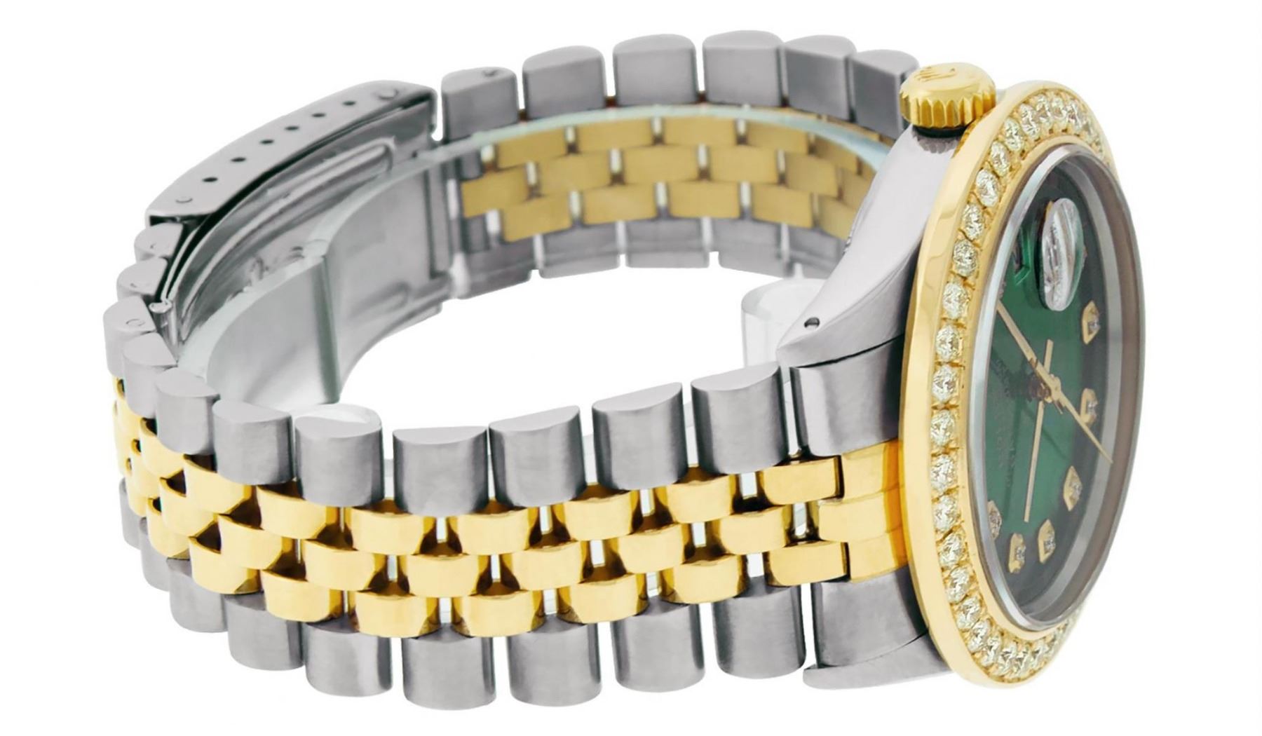One Mens 14K Yellow Gold Two Tone Rolex Datejust Polished Bright with Satin Finish, Serviced & Electronically Tested, 14K Yellow Gold And Stainless Steel Case: 36mm, Yellow Gold Crown, Custom Bezel: New 18K Yellow Gold Beadset Diamond Bezel, Diamond Count: 40 Diamonds On Bezel, Total Bezel Weight 2.5 Carat, Clarity: SI-VS, Color: G to H. Custom Crystal: New Scratch Resistant Synthetic Sapphire Cyclops Lens. Custom Hands: New Luminecent Hands. Movement: Automatic Winding Movement Caliber 3035. Custom Dial: Green Vignette Diamond Dial With Roman Track, Diamond Count: 10 Diamonds On Dial, Dial Color: G To H In Color, Clarity: VS2-SI1. Date Window: 3 O'Clock Position Date Display, Quickset, Model: Datejust. Condition: G-6 Extra Fine. Bracelet: 14K Yellow Gold And Stainless Steel Jubilee Band. Bright Polish & Satin Finish. 7.0 Inch Length, Adjustable. Standard Clasp, With Rolex Logo. This Watch Has Been Serviced and Polished And It Is Free Of All Dents And Scratches And Has Been Time Tested. This Watch Comes With A Rolex Box.