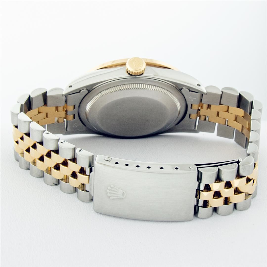 One Mens Pre Owned Yellow Gold Two Tone Rolex Datejust Polished, Serviced & Electronically Tested, Rolex Yellow Gold & Stainless Steel Case: 36mm,Rolex Yellow Gold Crown, Custom Bezel: New 18K Yellow Gold Beadset Diamond Bezel, Diamond Count: 40 Diamonds On Bezel, Total Bezel Weight 2.5 Carat, Clarity: SI-VS, Color: G to H. Custom Crystal: New Scratch Resistant Synthetic Sapphire Cyclops Lens. Custom Hands: New Luminescent Hands. Rolex Movement: Automatic Winding Movement. Rolex Dial: Champagne Jubilee Dial With Index Hour Markers and Small Track With Lumi Dots. Date Window: 3 O'Clock Position Date Display, Quickset, Model: Datejust. Condition: G-6 Extra Fine. Rolex Bracelet: Two Tone Yellow Gold & Stainless Steel Jubilee Band. Bright Polish. 7.0 Inch Length, Adjustable. Standard Clasp, With Rolex Logo. This Watch Has Been Serviced Time Tested And Is In Excellent Condition It Is Free Of All Scratches And Dents.