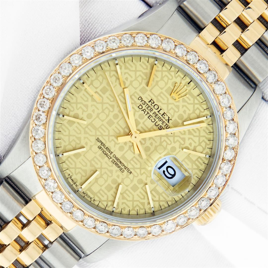 One Mens Pre Owned Yellow Gold Two Tone Rolex Datejust Polished, Serviced & Electronically Tested, Rolex Yellow Gold & Stainless Steel Case: 36mm,Rolex Yellow Gold Crown, Custom Bezel: New 18K Yellow Gold Beadset Diamond Bezel, Diamond Count: 40 Diamonds On Bezel, Total Bezel Weight 2.5 Carat, Clarity: SI-VS, Color: G to H. Custom Crystal: New Scratch Resistant Synthetic Sapphire Cyclops Lens. Custom Hands: New Luminescent Hands. Rolex Movement: Automatic Winding Movement. Rolex Dial: Champagne Jubilee Dial With Index Hour Markers and Small Track With Lumi Dots. Date Window: 3 O'Clock Position Date Display, Quickset, Model: Datejust. Condition: G-6 Extra Fine. Rolex Bracelet: Two Tone Yellow Gold & Stainless Steel Jubilee Band. Bright Polish. 7.0 Inch Length, Adjustable. Standard Clasp, With Rolex Logo. This Watch Has Been Serviced Time Tested And Is In Excellent Condition It Is Free Of All Scratches And Dents.