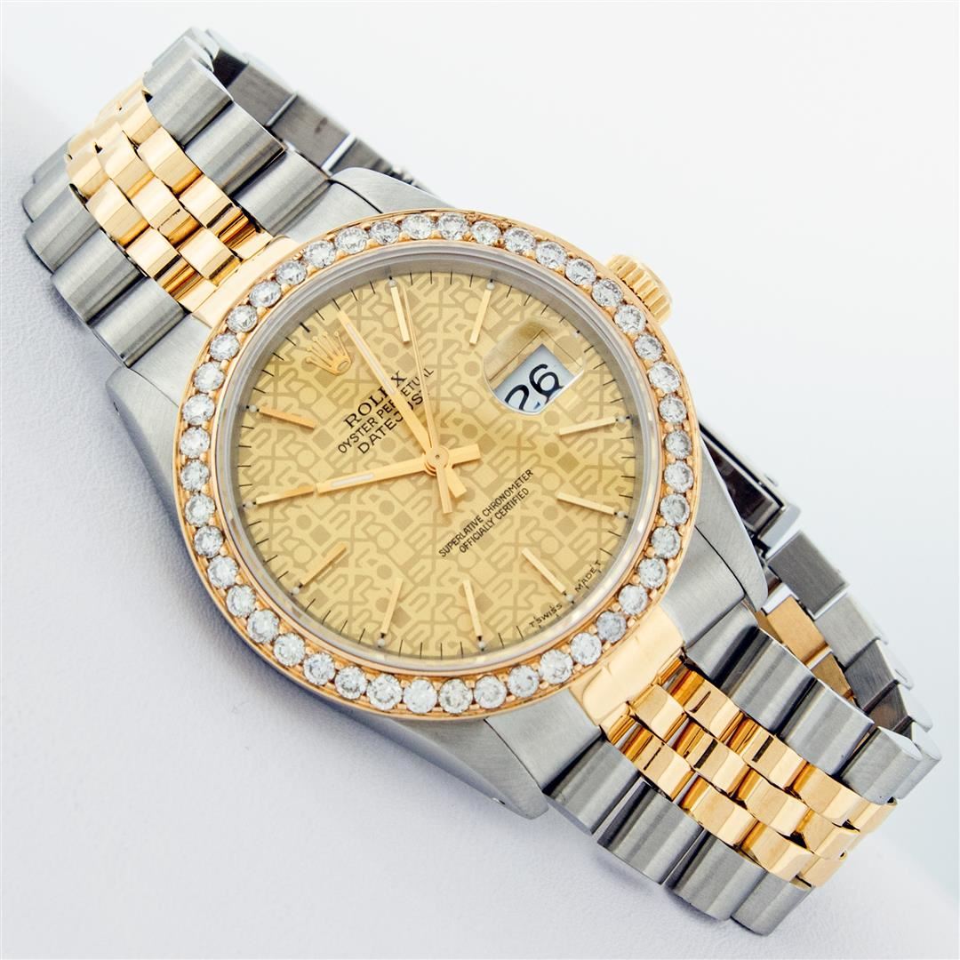 One Mens Pre Owned Yellow Gold Two Tone Rolex Datejust Polished, Serviced & Electronically Tested, Rolex Yellow Gold & Stainless Steel Case: 36mm,Rolex Yellow Gold Crown, Custom Bezel: New 18K Yellow Gold Beadset Diamond Bezel, Diamond Count: 40 Diamonds On Bezel, Total Bezel Weight 2.5 Carat, Clarity: SI-VS, Color: G to H. Custom Crystal: New Scratch Resistant Synthetic Sapphire Cyclops Lens. Custom Hands: New Luminescent Hands. Rolex Movement: Automatic Winding Movement. Rolex Dial: Champagne Jubilee Dial With Index Hour Markers and Small Track With Lumi Dots. Date Window: 3 O'Clock Position Date Display, Quickset, Model: Datejust. Condition: G-6 Extra Fine. Rolex Bracelet: Two Tone Yellow Gold & Stainless Steel Jubilee Band. Bright Polish. 7.0 Inch Length, Adjustable. Standard Clasp, With Rolex Logo. This Watch Has Been Serviced Time Tested And Is In Excellent Condition It Is Free Of All Scratches And Dents.