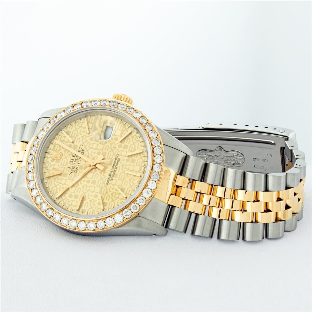 One Mens Pre Owned Yellow Gold Two Tone Rolex Datejust Polished, Serviced & Electronically Tested, Rolex Yellow Gold & Stainless Steel Case: 36mm,Rolex Yellow Gold Crown, Custom Bezel: New 18K Yellow Gold Beadset Diamond Bezel, Diamond Count: 40 Diamonds On Bezel, Total Bezel Weight 2.5 Carat, Clarity: SI-VS, Color: G to H. Custom Crystal: New Scratch Resistant Synthetic Sapphire Cyclops Lens. Custom Hands: New Luminescent Hands. Rolex Movement: Automatic Winding Movement. Rolex Dial: Champagne Jubilee Dial With Index Hour Markers and Small Track With Lumi Dots. Date Window: 3 O'Clock Position Date Display, Quickset, Model: Datejust. Condition: G-6 Extra Fine. Rolex Bracelet: Two Tone Yellow Gold & Stainless Steel Jubilee Band. Bright Polish. 7.0 Inch Length, Adjustable. Standard Clasp, With Rolex Logo. This Watch Has Been Serviced Time Tested And Is In Excellent Condition It Is Free Of All Scratches And Dents.
