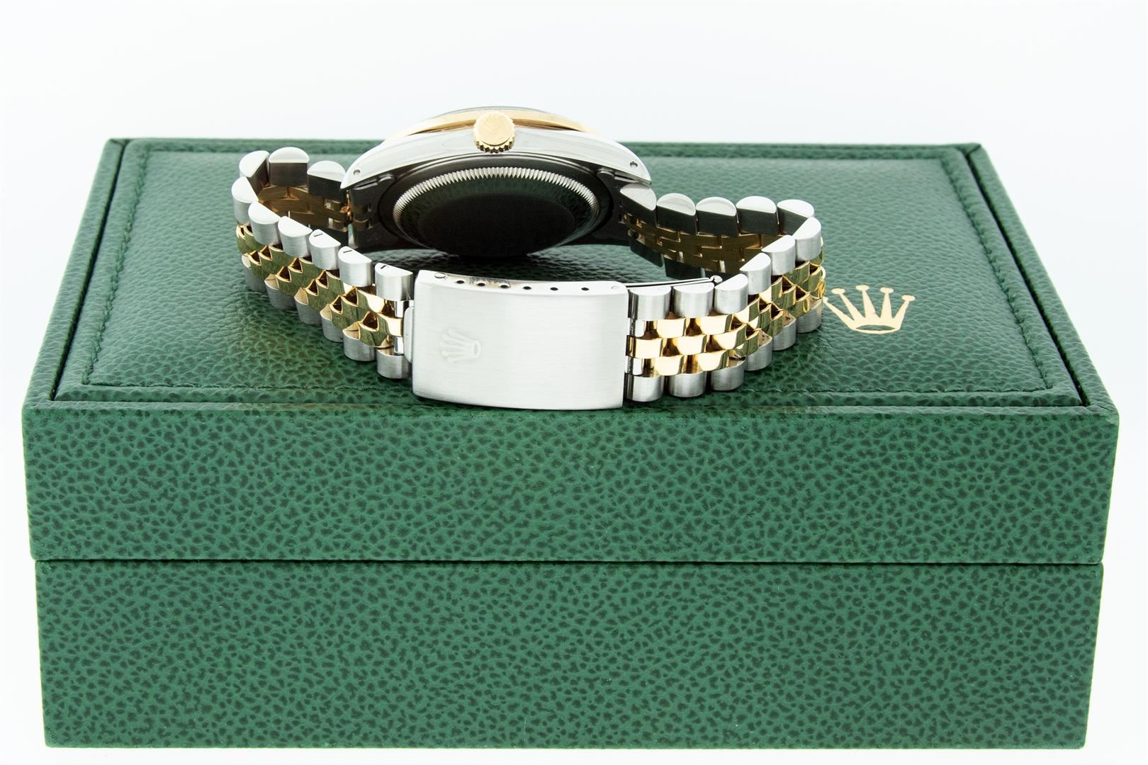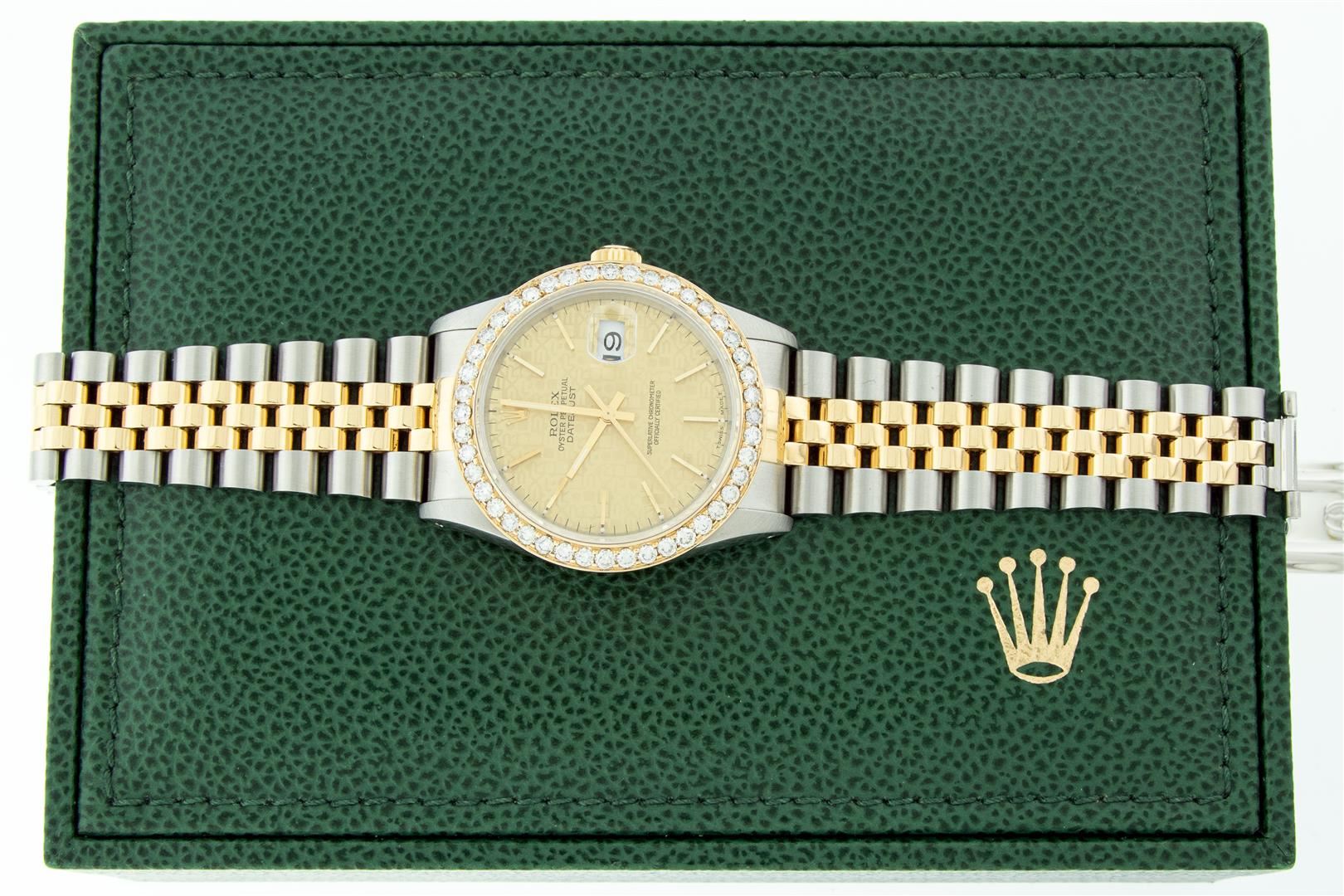 One Mens Pre Owned Yellow Gold Two Tone Rolex Datejust Polished, Serviced & Electronically Tested, Rolex Yellow Gold & Stainless Steel Case: 36mm,Rolex Yellow Gold Crown, Custom Bezel: New 18K Yellow Gold Beadset Diamond Bezel, Diamond Count: 40 Diamonds On Bezel, Total Bezel Weight 2.5 Carat, Clarity: SI-VS, Color: G to H. Custom Crystal: New Sapphire With Magnified Date Window. Custom Hands: New Luminescent Hands. Rolex Movement: Automatic Winding Movement. Rolex Dial: Champagne Jubilee Dial With Index Hour Markers and Dash Track With Lumi Dots. Date Window: 3 O'Clock Position Date Display, Quickset, Model: Datejust. Condition: G-6 Extra Fine. Rolex Bracelet: Two Tone Yellow Gold & Stainless Steel Jubilee Band. Bright Polish. 7.0 Inch Length, Adjustable. Standard Clasp, With Rolex Logo. This Watch Has Been Serviced Time Tested And Is In Excellent Condition It Is Free Of All Scratches And Dents.