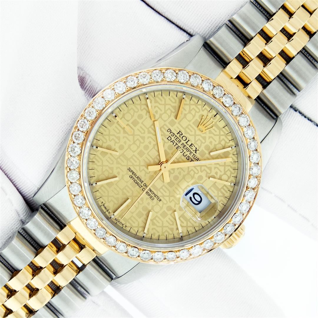 One Mens Pre Owned Yellow Gold Two Tone Rolex Datejust Polished, Serviced & Electronically Tested, Rolex Yellow Gold & Stainless Steel Case: 36mm,Rolex Yellow Gold Crown, Custom Bezel: New 18K Yellow Gold Beadset Diamond Bezel, Diamond Count: 40 Diamonds On Bezel, Total Bezel Weight 2.5 Carat, Clarity: SI-VS, Color: G to H. Custom Crystal: New Sapphire With Magnified Date Window. Custom Hands: New Luminescent Hands. Rolex Movement: Automatic Winding Movement. Rolex Dial: Champagne Jubilee Dial With Index Hour Markers and Dash Track With Lumi Dots. Date Window: 3 O'Clock Position Date Display, Quickset, Model: Datejust. Condition: G-6 Extra Fine. Rolex Bracelet: Two Tone Yellow Gold & Stainless Steel Jubilee Band. Bright Polish. 7.0 Inch Length, Adjustable. Standard Clasp, With Rolex Logo. This Watch Has Been Serviced Time Tested And Is In Excellent Condition It Is Free Of All Scratches And Dents.