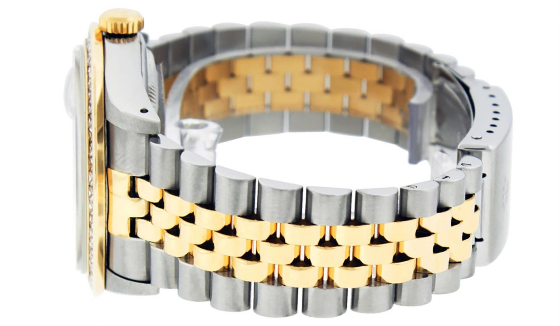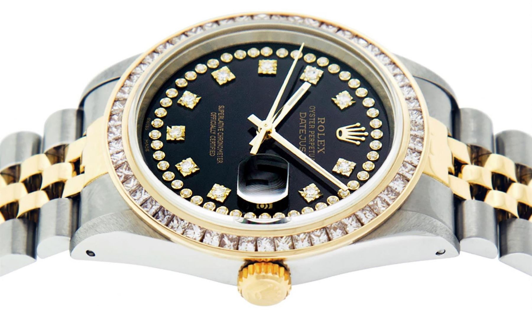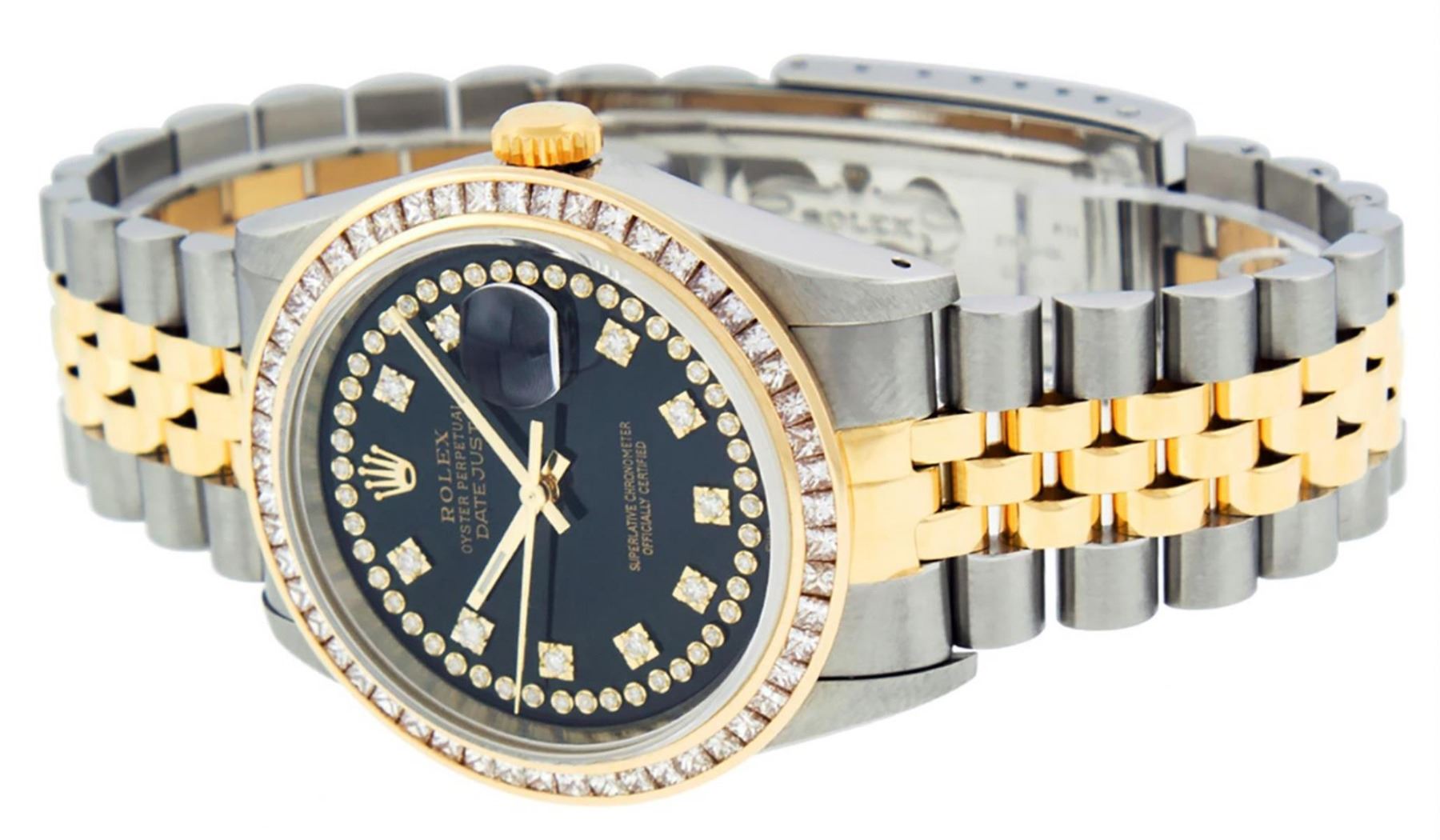 One Mens Yellow Gold & Stainless Steel Two Tone Rolex Datejust Polished Bright with Satin Finish, Serviced & Electronically Tested, Yellow Gold And Stainless Steel Case: 36mm, Yellow Gold Crown, Custom Bezel: New Yellow Gold Princess Cut Diamond Bezel, Diamond Count: 53 Diamonds, Total Weight 2.75 Carat, Clarity: SI-VS, Color: G to H. Custom Crystal: New Scratch Resistant Synthetic Sapphire Cyclops Lens. Custom Hands: New Luminecent Hands. Movement: Automatic Winding Movement. Custom Dial: Black String Diamond Dial, Diamond Count: 58 Diamond in Dial, Dial Color: G To H In Color, Clarity: VS2. Date Window: 3 O'Clock Position Date Display, Quickset, Model: Datejust. Condition: G-6 Extra Fine. Bracelet: Yellow Gold And Stainless Steel Jubilee. Bright Polish & Satin Finish. 7.0 Inch Length, Adjustable. Standard Clasp, With Rolex Logo. This Watch Has Been Serviced and Polished And It Is Free Of All Dents And Scratches And Has Been Time Tested.