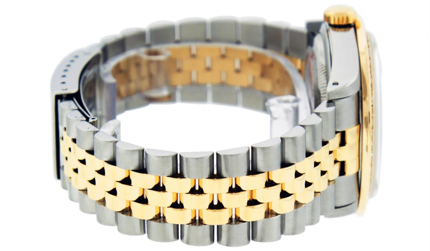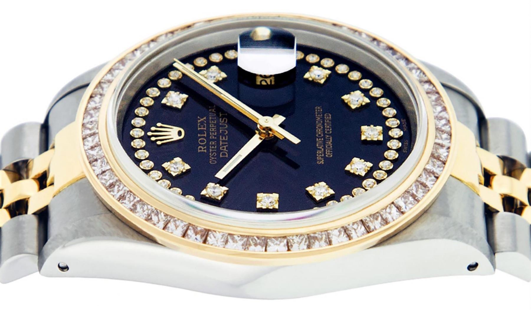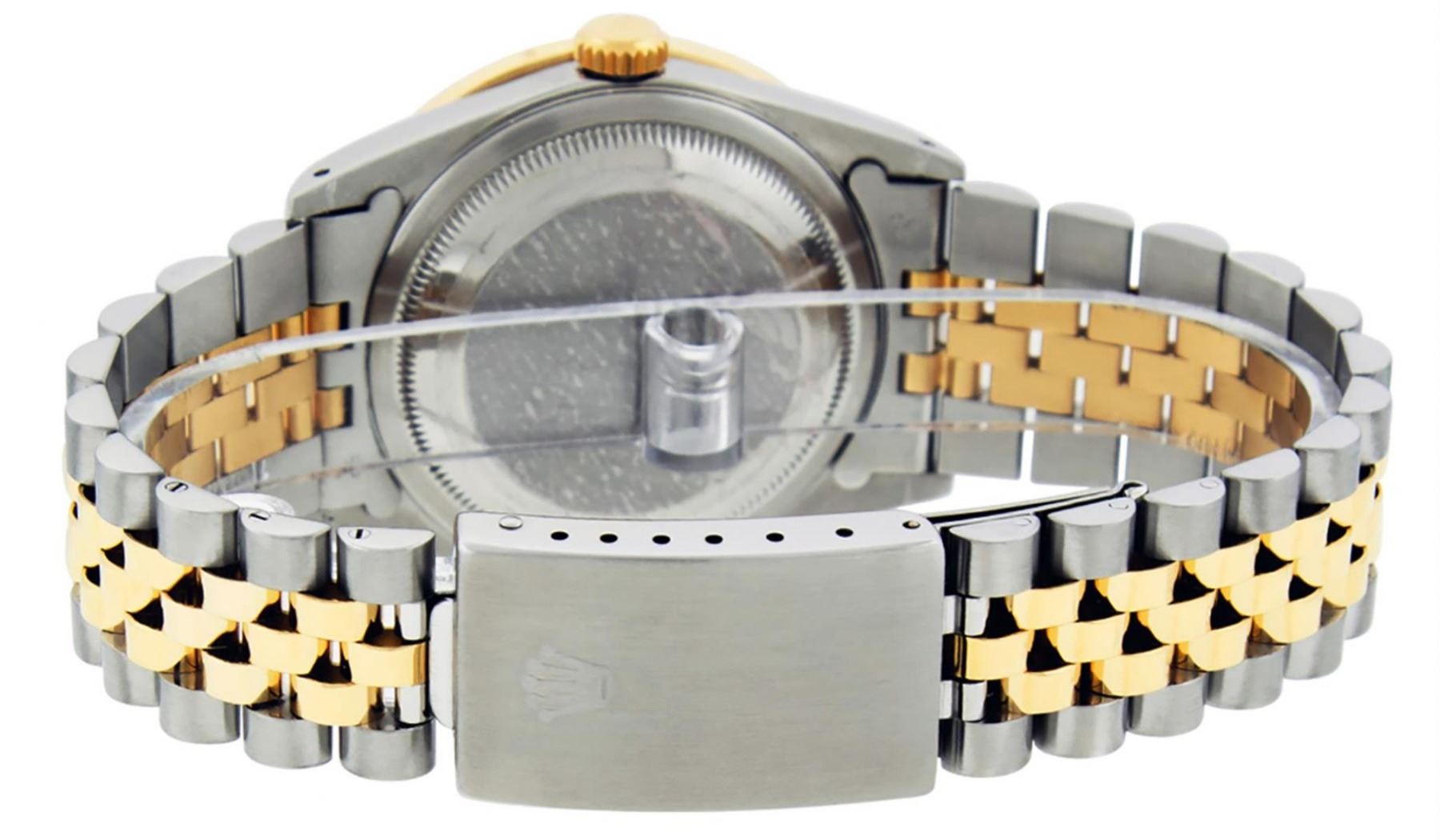 One Mens Yellow Gold & Stainless Steel Two Tone Rolex Datejust Polished Bright with Satin Finish, Serviced & Electronically Tested, Yellow Gold And Stainless Steel Case: 36mm, Yellow Gold Crown, Custom Bezel: New Yellow Gold Princess Cut Diamond Bezel, Diamond Count: 53 Diamonds, Total Weight 2.75 Carat, Clarity: SI-VS, Color: G to H. Custom Crystal: New Scratch Resistant Synthetic Sapphire Cyclops Lens. Custom Hands: New Luminecent Hands. Movement: Automatic Winding Movement. Custom Dial: Black String Diamond Dial, Diamond Count: 58 Diamond in Dial, Dial Color: G To H In Color, Clarity: VS2. Date Window: 3 O'Clock Position Date Display, Quickset, Model: Datejust. Condition: G-6 Extra Fine. Bracelet: Yellow Gold And Stainless Steel Jubilee. Bright Polish & Satin Finish. 7.0 Inch Length, Adjustable. Standard Clasp, With Rolex Logo. This Watch Has Been Serviced and Polished And It Is Free Of All Dents And Scratches And Has Been Time Tested.