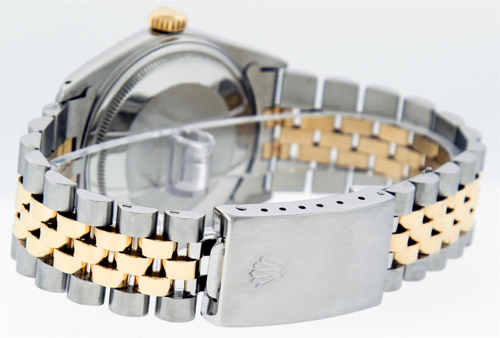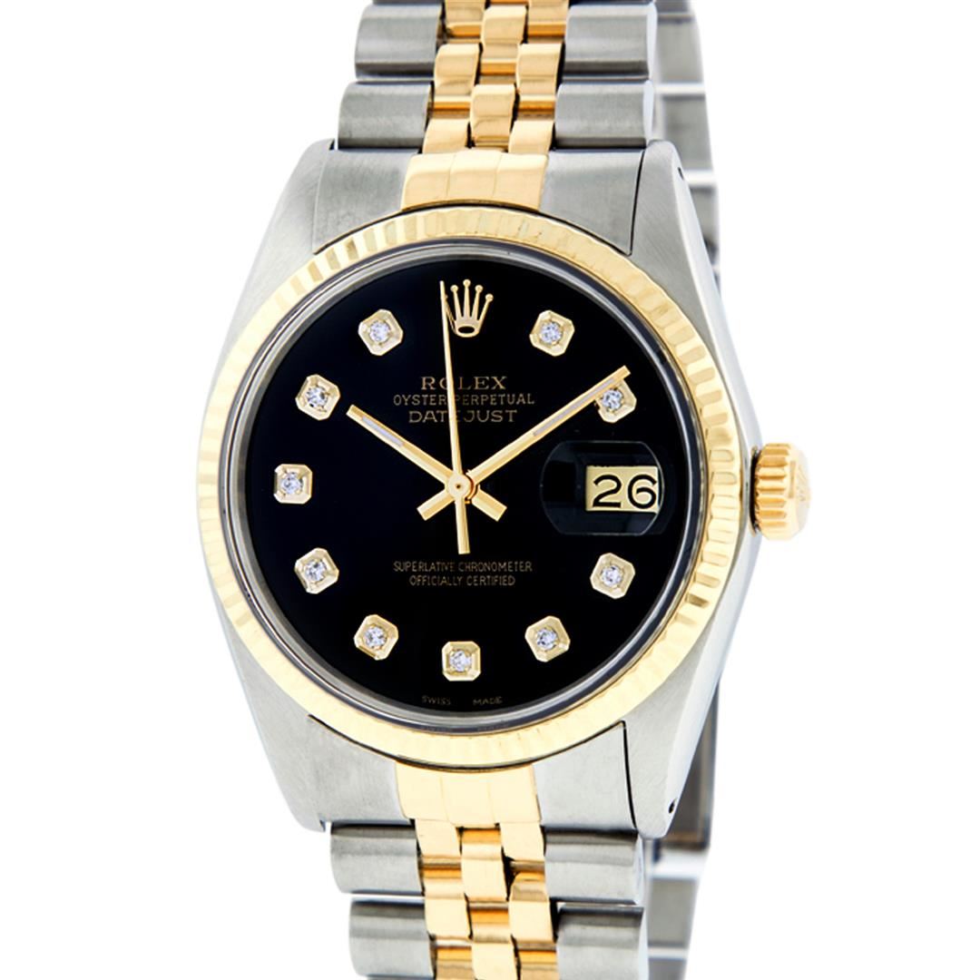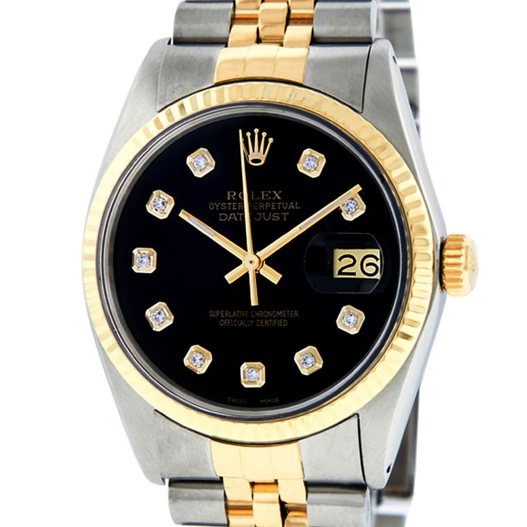 One Mens Yellow Gold Two Tone Rolex Datejust Polished, Serviced & Electronically Tested, Yellow Gold & Stainless Steel Case: 36mm, Yellow Gold Crown, Bezel: Yellow Gold Fluted Bezel. Custom Crystal: New Acrylic Cyclops Lens. Custom Hands: New Luminecent Hands. Movement: Automatic Winding Movement . Custom Dial: Black Diamond Dial, Diamond Count: 10 Diamonds In Dial, Color: G to H, Clarity: SI-VS. Date Window: 3 O'Clock Position Date Display, Quickset, Model: Condition: G-6 Extra Fine. Bracelet: Two Tone Yellow Gold & Stainless Steel Jubilee. Bright Polish. 7.0 Inch Length, Adjustable. Standard Clasp, With Rolex Logo. This Watch Has Been Serviced Time Tested And Is In Excellent Condition It Is Free Of All Scratches And Dents.