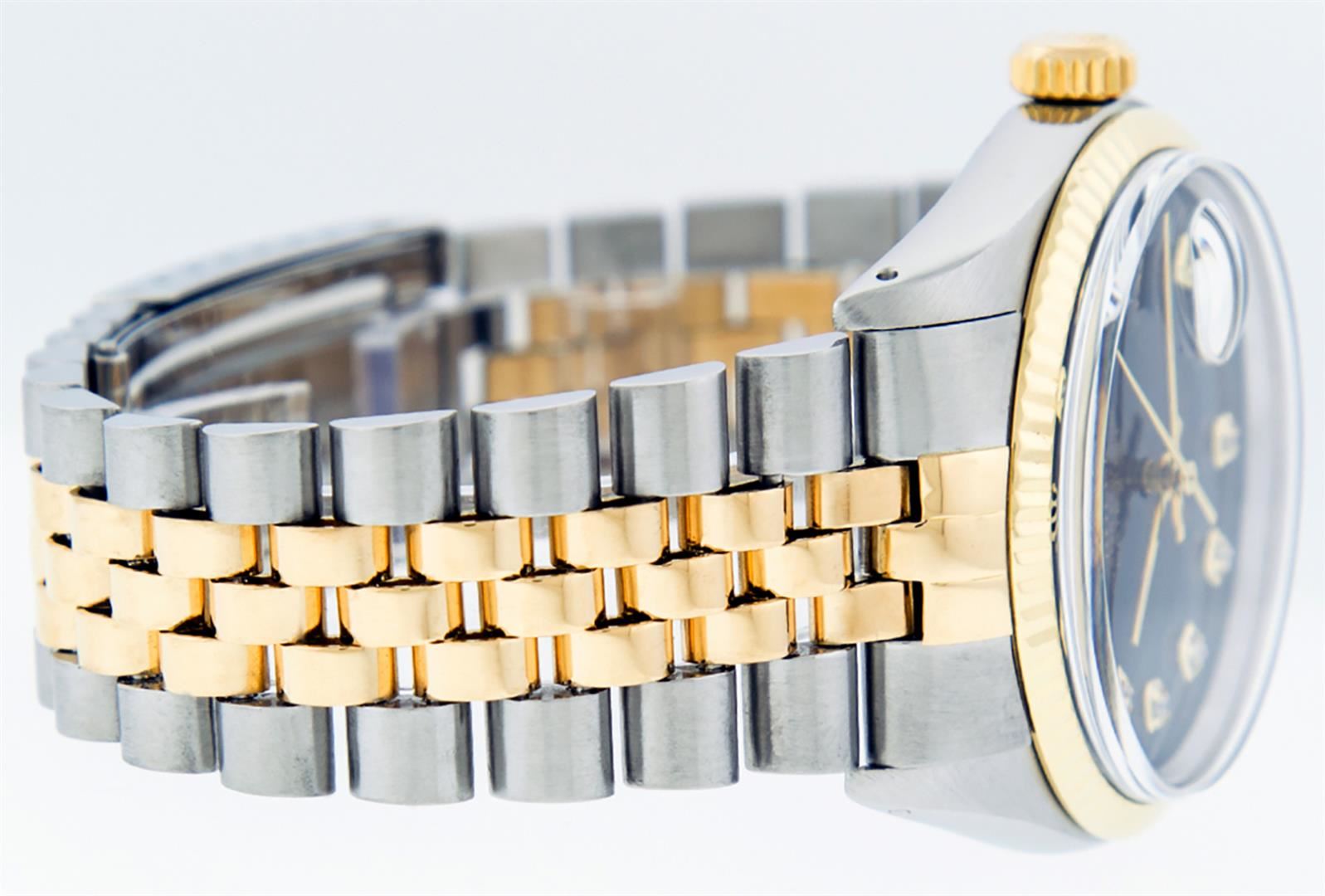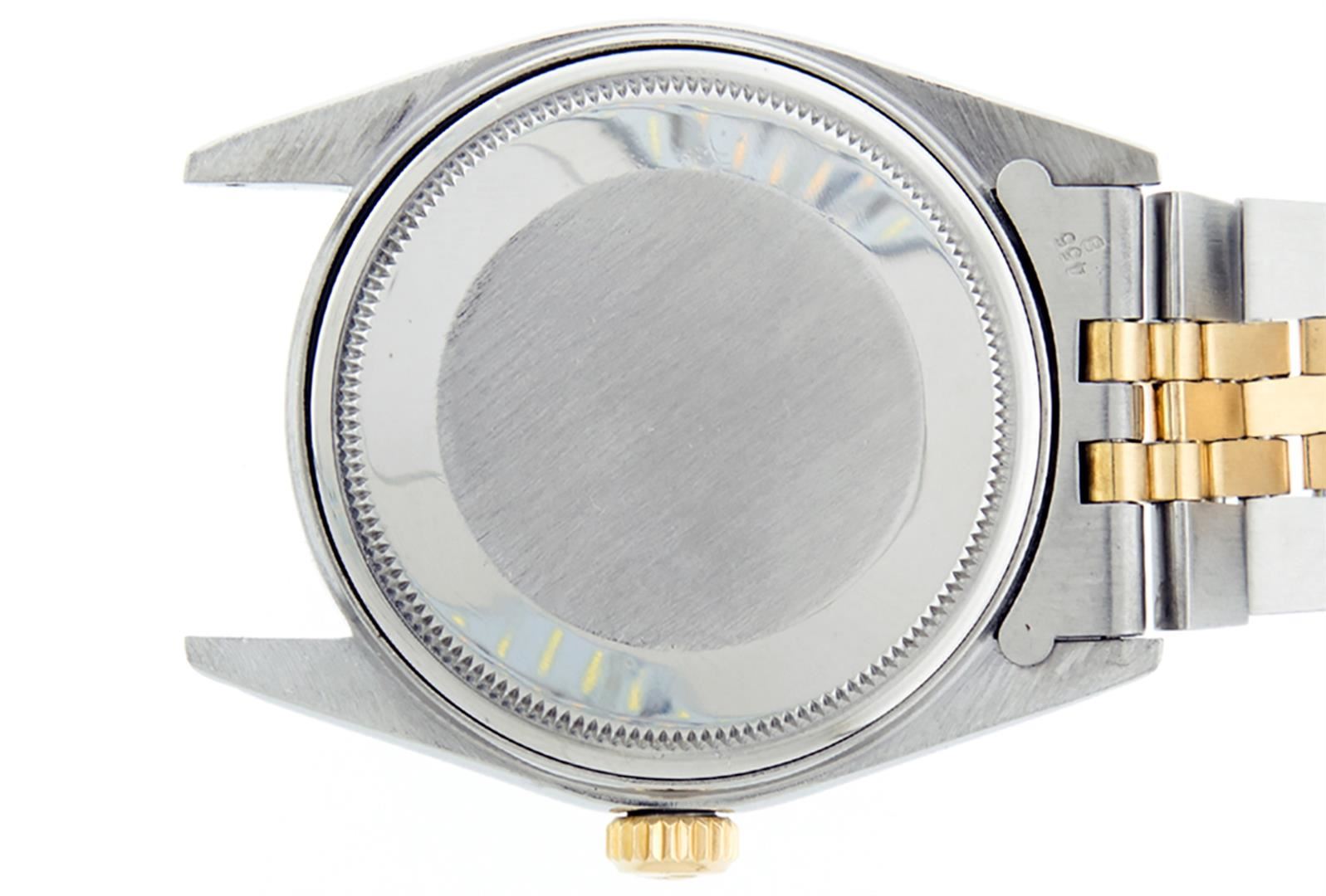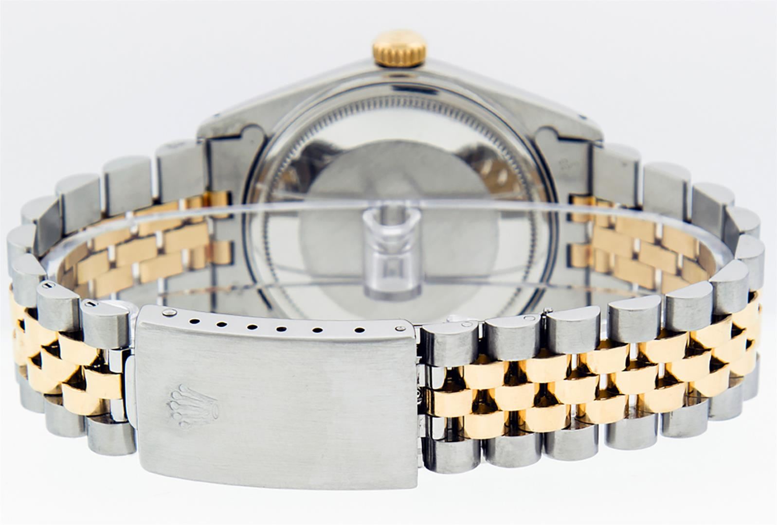 One Mens Yellow Gold Two Tone Rolex Datejust Polished, Serviced & Electronically Tested, Yellow Gold & Stainless Steel Case: 36mm, Yellow Gold Crown, Bezel: Yellow Gold Fluted Bezel. Custom Crystal: New Acrylic Cyclops Lens. Custom Hands: New Luminecent Hands. Movement: Automatic Winding Movement . Custom Dial: Black Diamond Dial, Diamond Count: 10 Diamonds In Dial, Color: G to H, Clarity: SI-VS. Date Window: 3 O'Clock Position Date Display, Quickset, Model: Condition: G-6 Extra Fine. Bracelet: Two Tone Yellow Gold & Stainless Steel Jubilee. Bright Polish. 7.0 Inch Length, Adjustable. Standard Clasp, With Rolex Logo. This Watch Has Been Serviced Time Tested And Is In Excellent Condition It Is Free Of All Scratches And Dents.