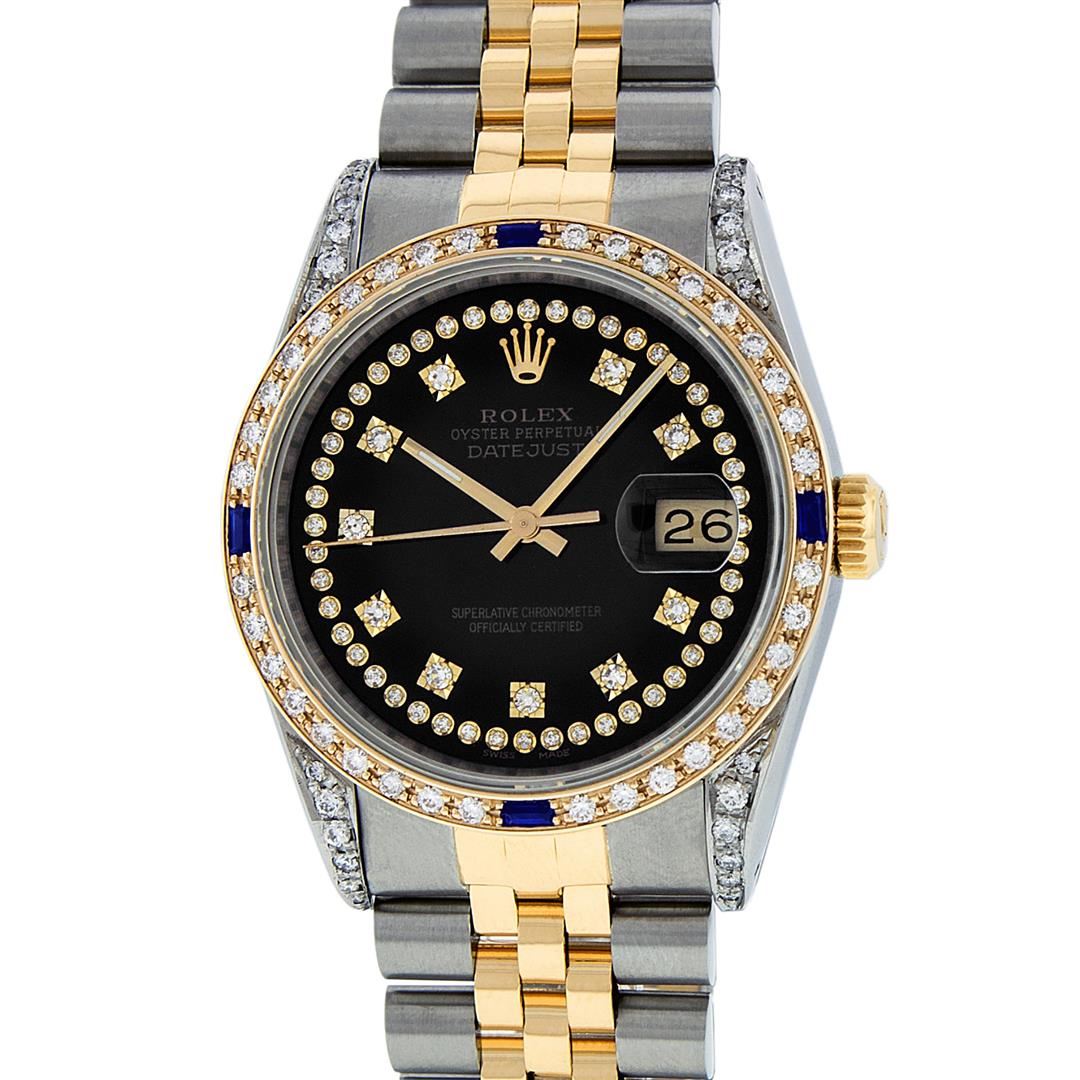 One Mens Pre Owned Yellow Gold Rolex Datejust Polished Bright with Satin Finish, Serviced & Electronically Tested, Rolex Stainless Steel Case: 36mm, Custom Diamond Lugs: 28 Diamonds On Lugs, Color: G to H, Clarity: SI-VS. Rolex Yellow Gold Crown, Custom Bezel: New 18K Yellow Gold Bead set Diamond + Sapphire Bezel, Diamond + Stone Count: 36 Diamonds + 4 Sapphires, Clarity: SI-VS, Color: G to H. Custom Crystal: New Sapphire With Date Window. Custom Hands: New Luminescent Hands. Rolex Movement: Automatic Winding Movement. Custom Dial: Refinished To Black With Custom Added Diamonds, Stone Count: 58 Diamonds In Dial, Color: G to H, Clarity: VS2. Date Window: 3 O'clock Position Date Display, Quickset, Model: Datejust. Condition: G-6 Extra Fine. Rolex Bracelet: Yellow Gold And Stainless Steel Jubilee Band. Bright Polish & Satin Finish. 7.0 Inch Length, Adjustable. Standard Clasp, With Rolex Logo. This Watch Has Been Serviced And Polished It Is Free Of All Scratches And Dents.