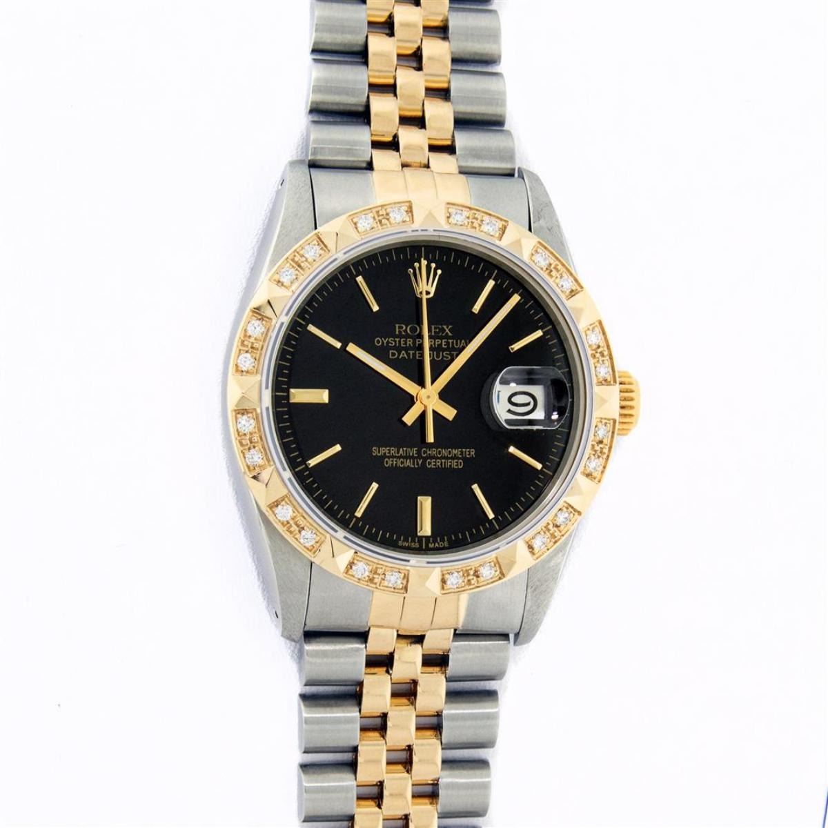 One Mens Yellow Gold Rolex Datejust Polished Bright with Satin Finish, Serviced & Electronically Tested, Stainless Steel Case: 36mm, Yellow Gold Crown, Custom Bezel: New 18K Yellow Gold Pyramid Diamond Bezel, Diamond Count: 24 Diamonds, Total Weight .75 Carat, Clarity: SI-VS, Color: G to H. Custom Crystal: New Scratch Resistant Synthetic Sapphire Cyclops Lens. Custom Hands: New Luminecent Hands. Movement: Automatic Winding Movement. Custom Dial: Black Index Dial With Dash Track & Lumi Dots. Date Window: 3 O'Clock Position Date Display, Quickset, Model: Datejust. Condition: G-6 Extra Fine. Bracelet: Yellow Gold And Stainless Steel Jubilee Band. Bright Polish & Satin Finish. 7.0 Inch Length, Adjustable. Standard Clasp, With Rolex Logo. This Watch Has Been Serviced And Polished It Is Free Of All Scratches And Dents.