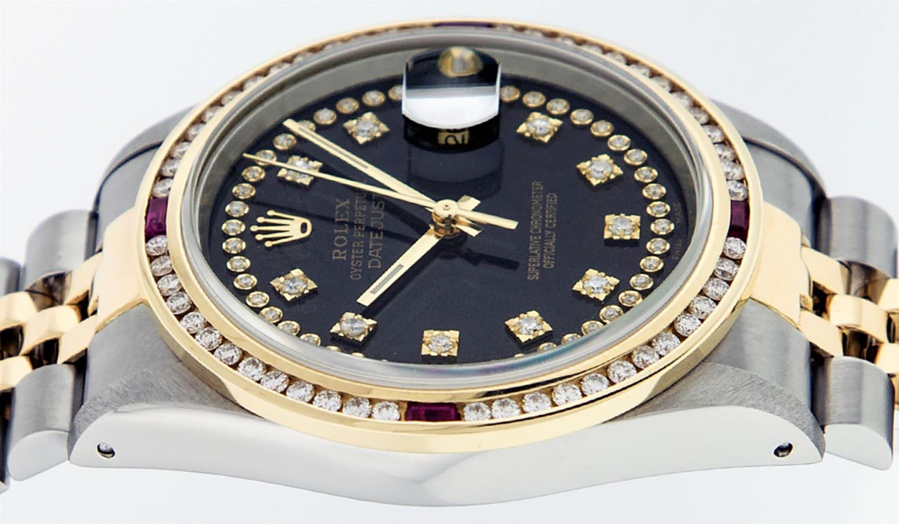 One Mens Yellow Gold Two Tone Rolex Datejust Polished, Serviced & Electronically Tested, Yellow Gold & Stainless Steel Case: 36mm, Yellow Gold Crown, Custom Bezel: 18K Yellow Gold Ruby Channel Set Diamond Bezel, Diamond Count: 52 Diamonds + 4 Rubies, Total Weight 1.30 Carat, Clarity: SI-VS, Color: G to H. Custom Crystal: New Scratch Resistant Synthetic Sapphire Cyclops Lens. Custom Hands: New Luminecent Hands. Movement: Automatic Winding Movement. Custom Dial: Black String Diamond Dial With Single Cut Diamonds, Diamond Count: 58 Diamonds in Dial. Date Window: 3 O'Clock Position Date Display, Quickset, Model: Datejust. Condition: G-6 Extra Fine. Bracelet: Two Tone Yellow Gold & Stainless Steel Jubilee Band. Bright Polish. 7.0 Inch Length, Adjustable. Standard Clasp, With Rolex Logo. This Watch Has Been Serviced Time Tested And Is In Excellent Condition It Is Free Of All Scratches And Dents.