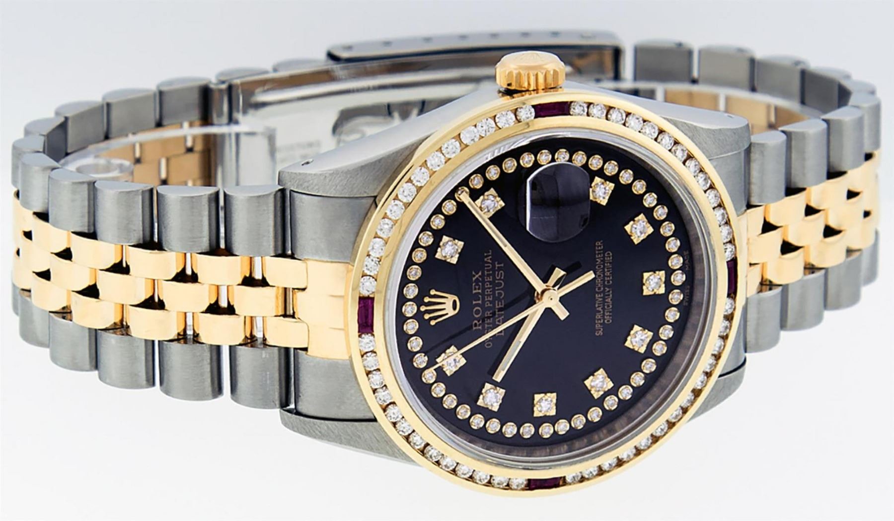One Mens Yellow Gold Two Tone Rolex Datejust Polished, Serviced & Electronically Tested, Yellow Gold & Stainless Steel Case: 36mm, Yellow Gold Crown, Custom Bezel: 18K Yellow Gold Ruby Channel Set Diamond Bezel, Diamond Count: 52 Diamonds + 4 Rubies, Total Weight 1.30 Carat, Clarity: SI-VS, Color: G to H. Custom Crystal: New Scratch Resistant Synthetic Sapphire Cyclops Lens. Custom Hands: New Luminecent Hands. Movement: Automatic Winding Movement. Custom Dial: Black String Diamond Dial With Single Cut Diamonds, Diamond Count: 58 Diamonds in Dial. Date Window: 3 O'Clock Position Date Display, Quickset, Model: Datejust. Condition: G-6 Extra Fine. Bracelet: Two Tone Yellow Gold & Stainless Steel Jubilee Band. Bright Polish. 7.0 Inch Length, Adjustable. Standard Clasp, With Rolex Logo. This Watch Has Been Serviced Time Tested And Is In Excellent Condition It Is Free Of All Scratches And Dents.
